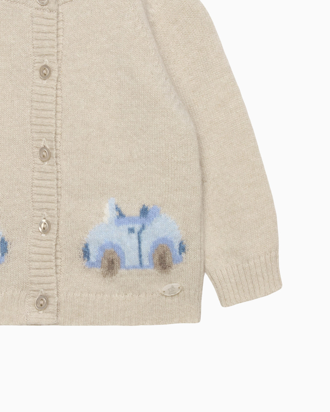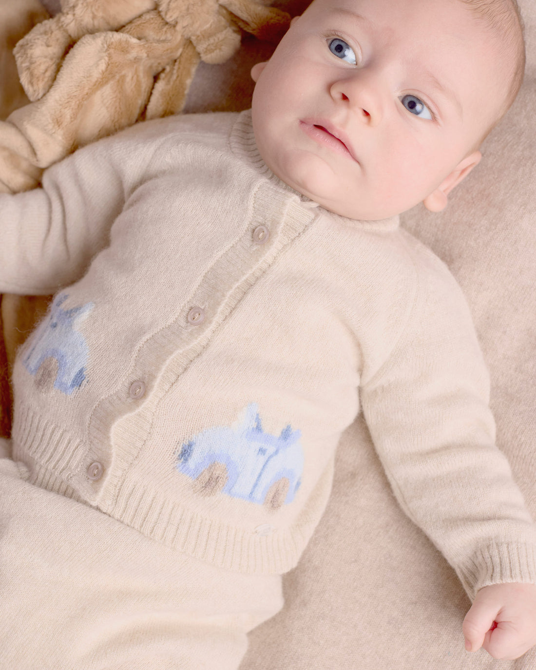 Made in a super soft and warm cashmere mix, this cardigan for newborns features a sweet vintage car intarsia design on the front, pearlized buttons down the center and a pearlized Lapinou badge. Pair with our matching leggings for an adorable outfit.