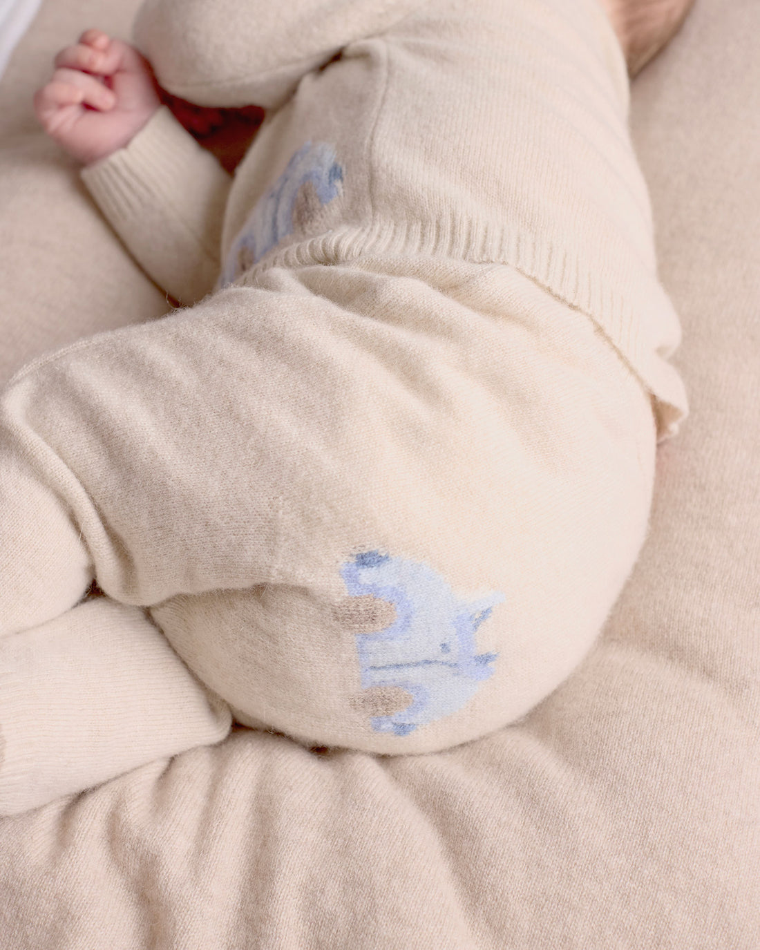 These wonderfully soft and warm cashmere mix leggings for newborns comes feature a sweet vintage car intarsia design on the bottom. Pair with our matching cardigan and booties for an adorable outfit.