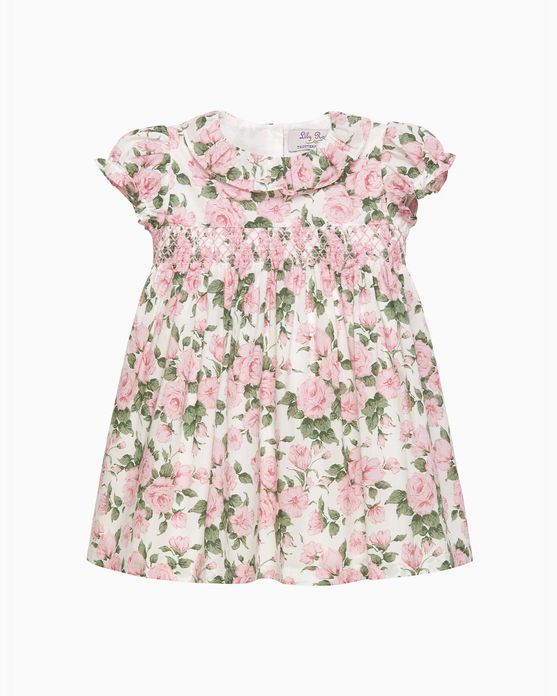 Made in Liberty's Carline print fabric, this beautiful rose floral design dates from the 90s and draws inspiration from the bold blooms synonymous with classic 50s prints. This smart party dress comes with pretty puff sleeves, a self-fabric willow collar and beautiful smocking across the front for the perfect finish. Fully lined and perfect for twirling, it's the ultimate summer party dress! Please note, sizes 3/6M & 6/12M do not feature a bow at the back to provide the optimum comfort when baby is lying down.