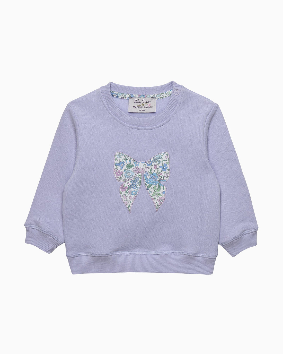 This more relaxed sweatshirt for baby girls comes in a fresh lilac colorway and features a statement appliqué bow design on the front in Liberty's Emma Amelia print fabric, a sister print to Emma Bloom that embraces Liberty’s classic floral style. Made in a super soft jersey with elasticated cuffs and hem, this makes a great go-to layer for everyday dressing.