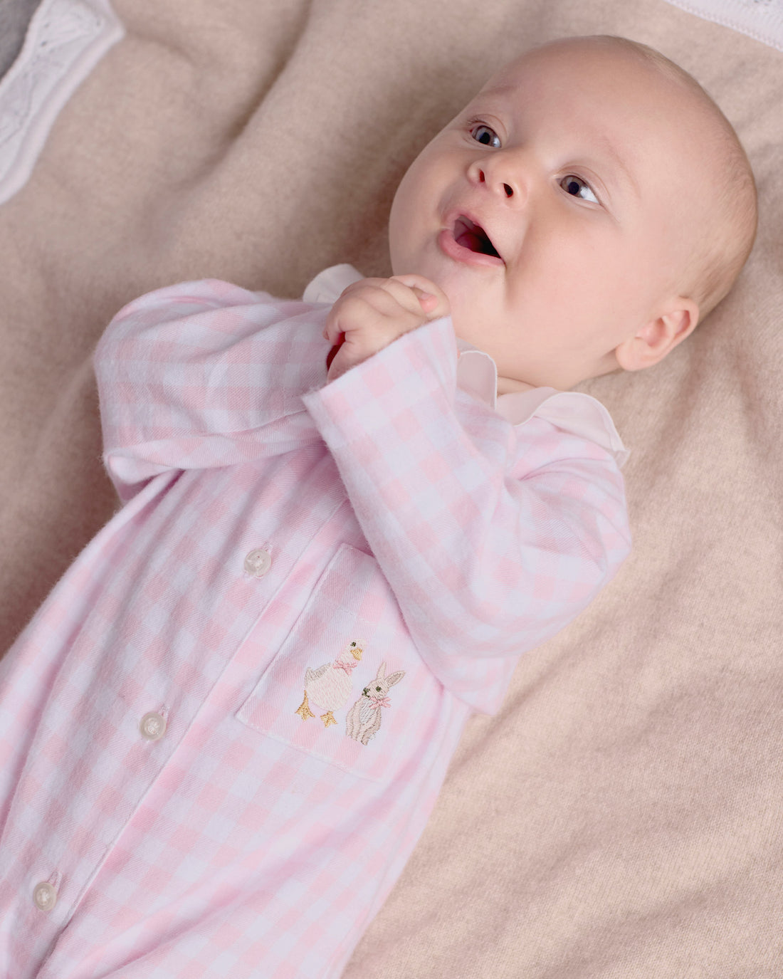 Our gorgeous Little Freya All-in-One provides warmth and comfort in soft, brushed cotton flannel. Its classic pink gingham colorway is enhanced by a delicate, white willow collar and pocket for a timeless look. They feature a pearlized button down front complete with our sweet duck & bunny embroidered design - just the ticket for sweet dreams and a good night's sleep. A comfortable outfit that will take them from cot to daytime, it's sure to become your new favorite. Popper fastenings at the leg allow for easy dressing and changing.