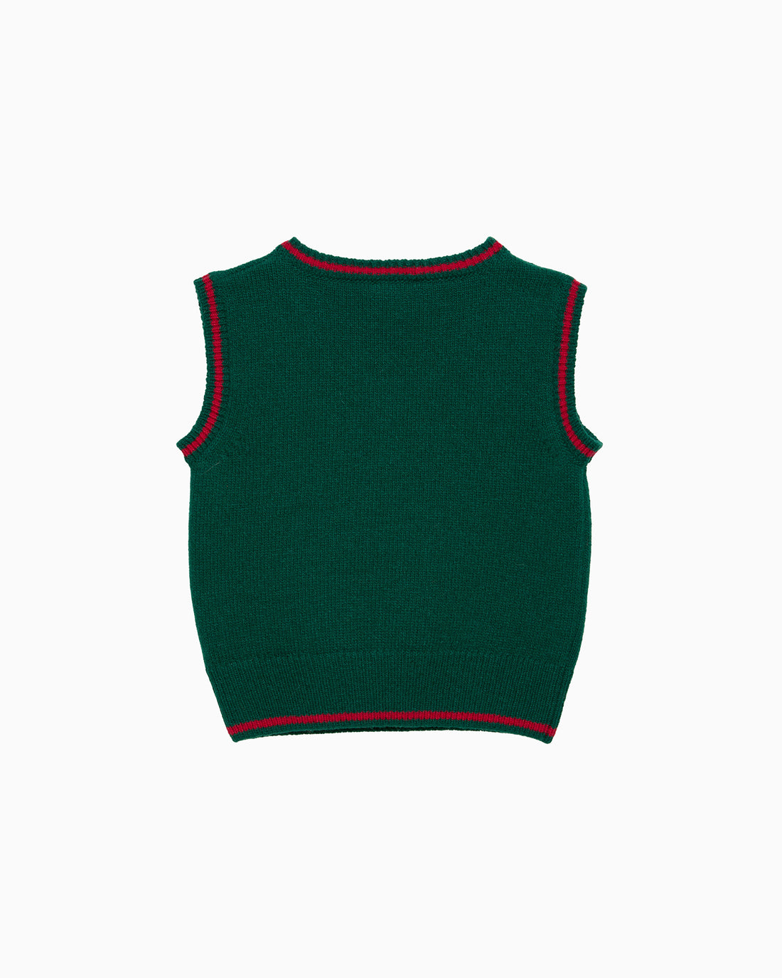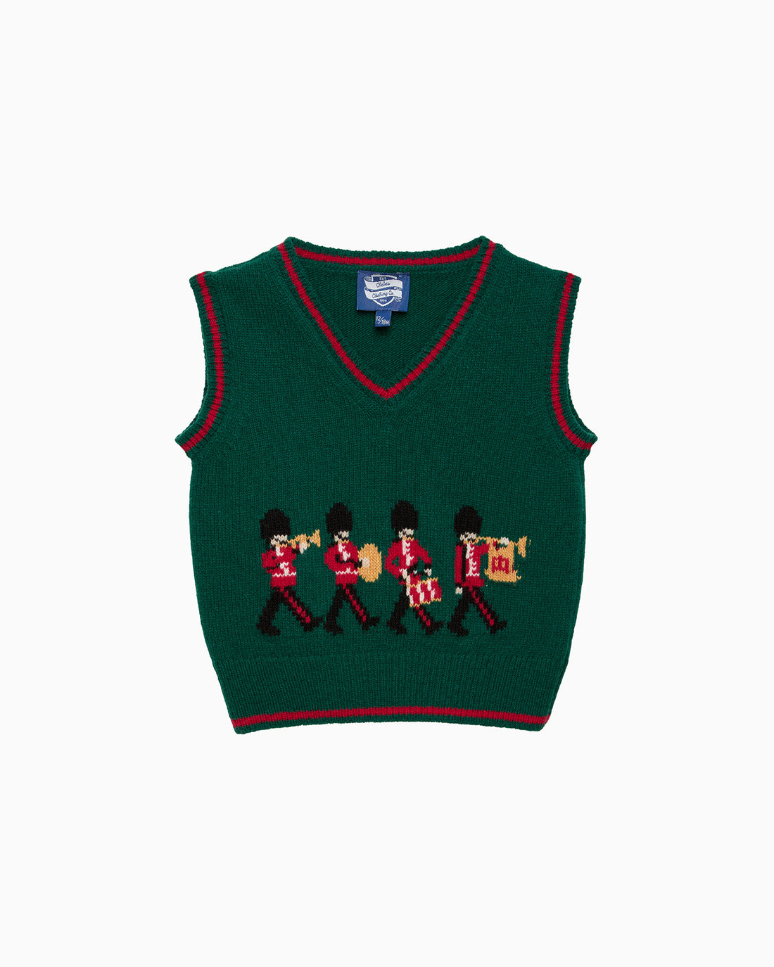 Made in soft and warm cashmere mix, this smart green tank top with contrasting red trim is sure to get you noticed. A Trotter's favorite, it features our classic guardsmen band marching along the bottom hemline. Layer over a shirt and pair with some smart pants for a classic everyday look.