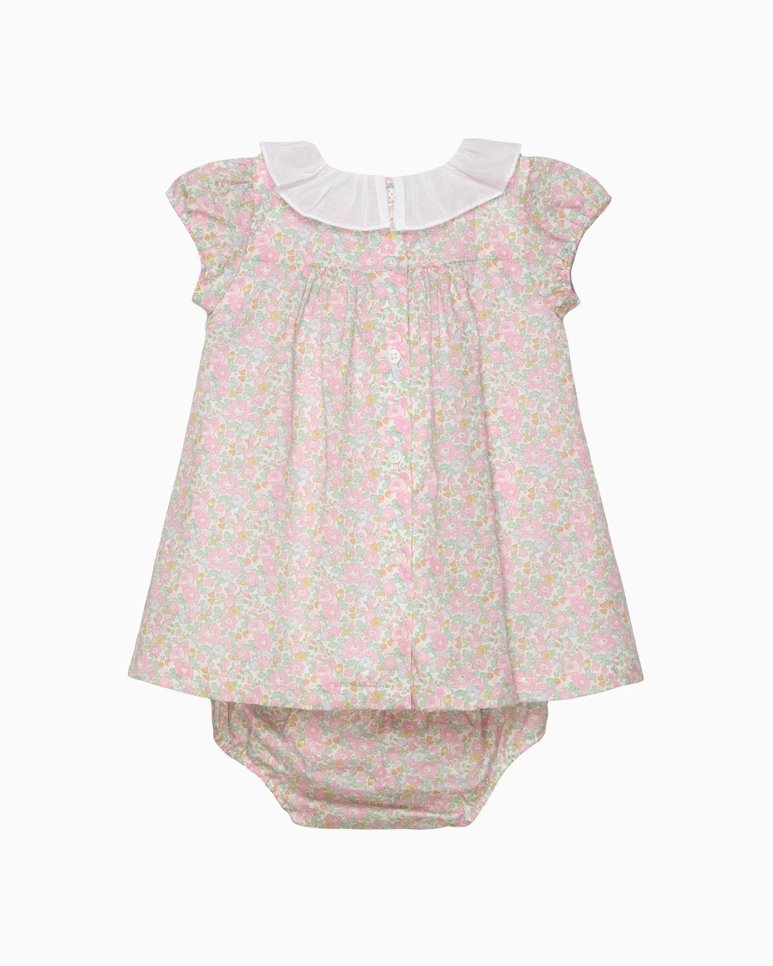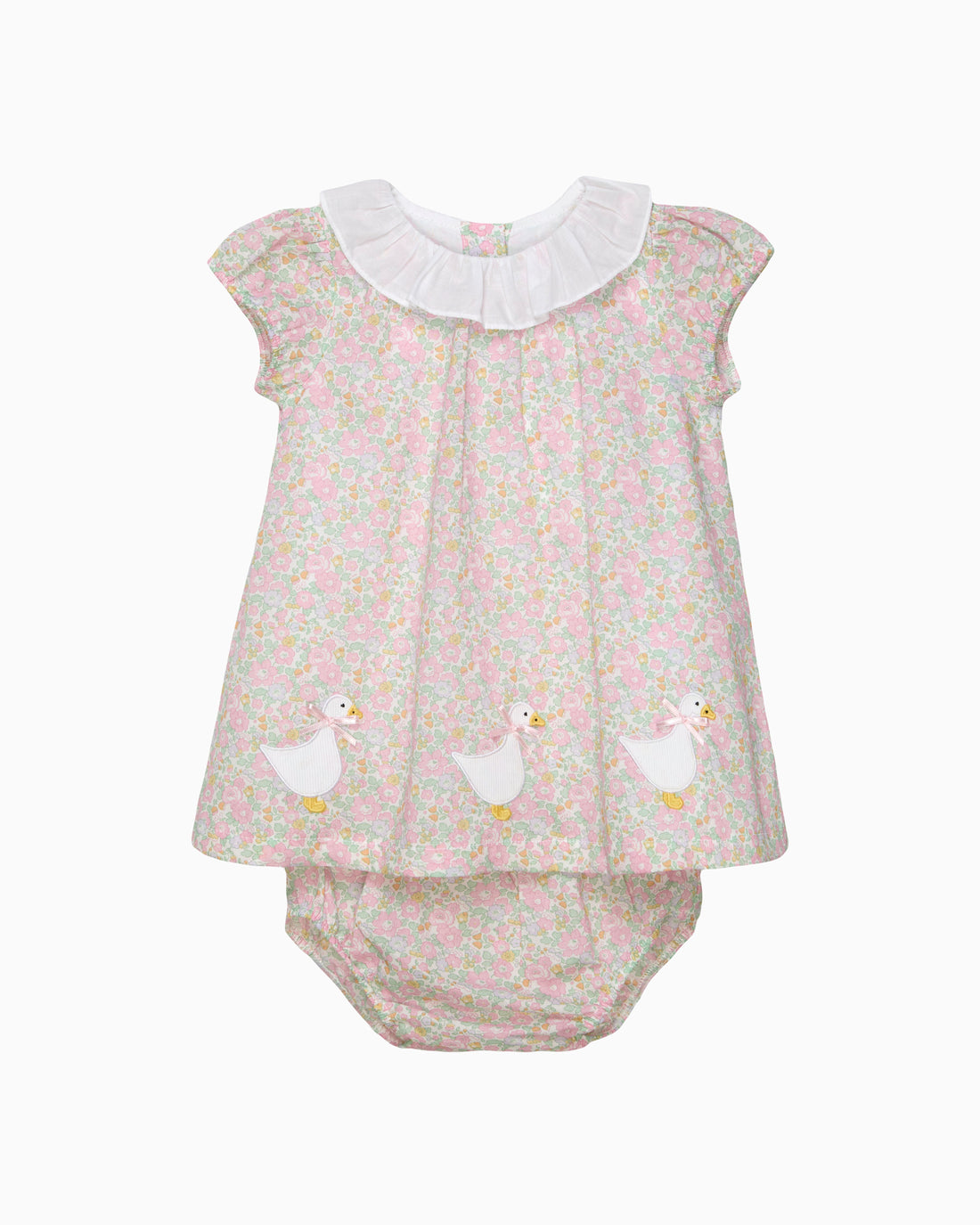 Our classic My First Duck Dress makes a beautiful gift and a wonderful keepsake for any new arrivals. Made in Liberty's Betsy Ann print fabric, a smaller scale version of their best-selling Betsy design, it features short puffed sleeves, a delicate white willow ruffle collar and our signature appliqué ducks along the hem, complete with pink satin bow detailing. Fully cotton lined, it's sold with a pair of matching Betsy Ann knickers for the ultimate baby girl outfit.