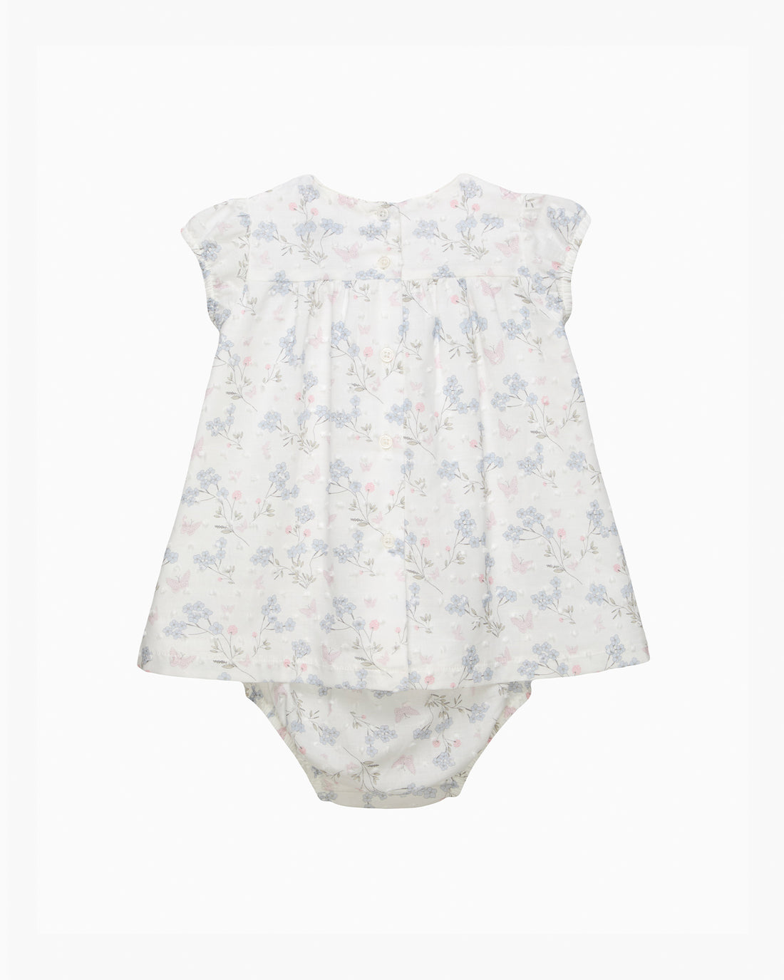 Our best-selling smocked dress is also available for newborns. Made in a beautiful blue butterfly print fabric with delicate textured plumets detailing, it comes complete with dainty smocked panel across the front. This collarless style features a smart self-fabric piping trim around the neckline and comes fully cotton lined and is sold with a pair of matching knickers for the ultimate baby girl outfit.