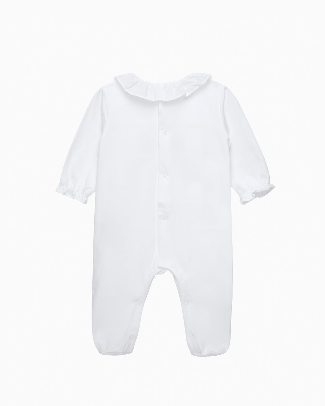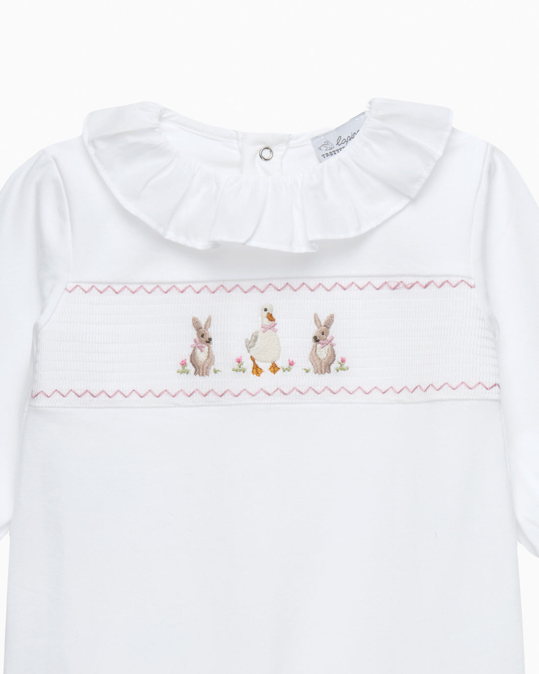 Sweet and timeless, this beautiful onesie features a delicate willow collar and charming smocked detail across the chest, complete with our adorable Duck and Bunny design.