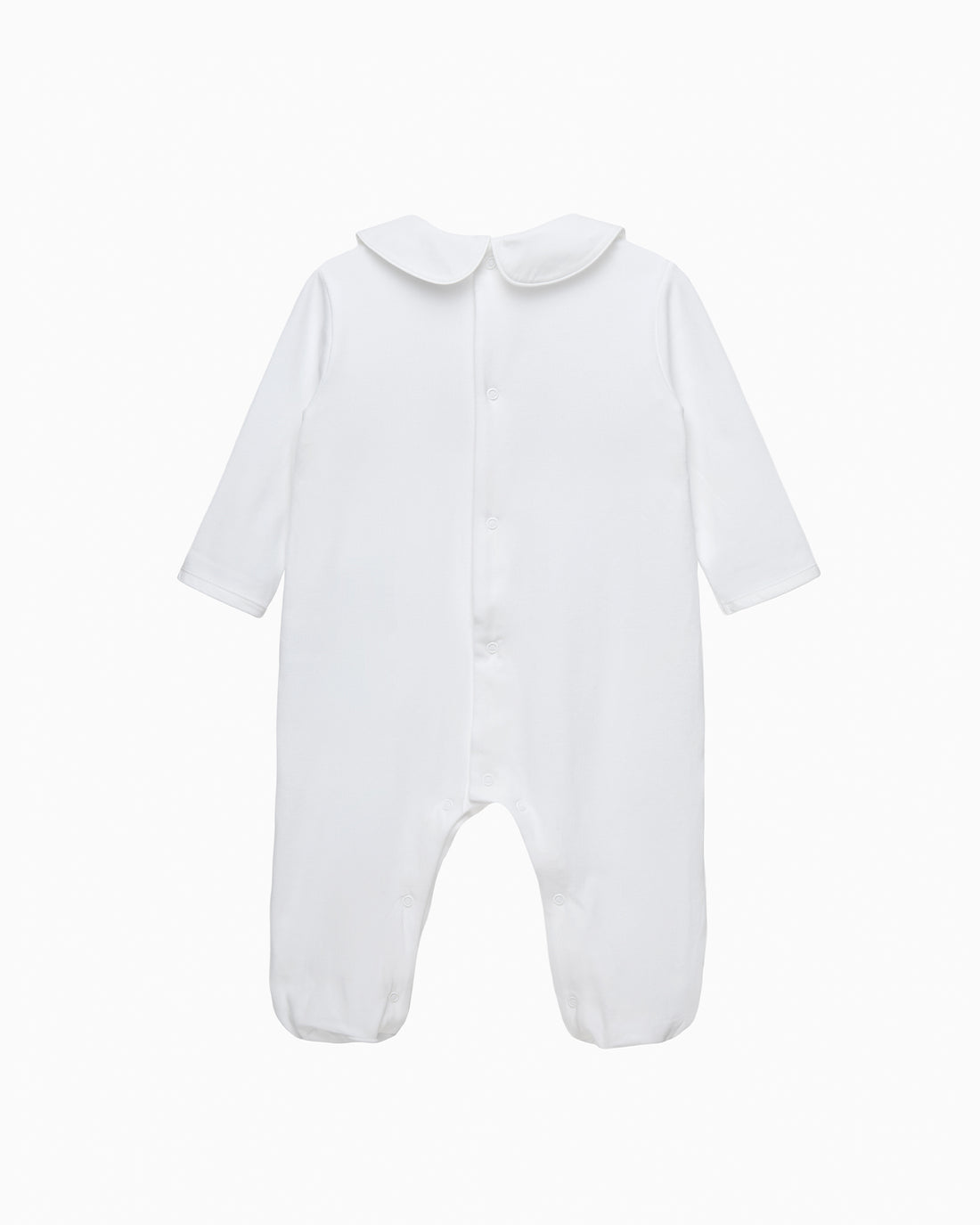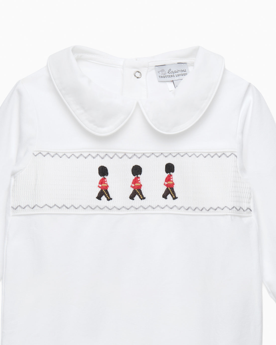 A beautiful piece for your little one's wardrobe, this classic white onesie features a crisp Peter Pan collar and delicate smocking across the chest, finished with our signature Marching Guardsman design. Made from soft, breathable cotton for all-day comfort, it's perfect for special occasions