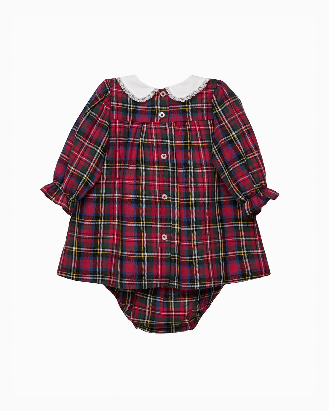 Made in festive red plaid, this baby tartan duck dress makes a beautiful gift and a wonderful keepsake for any new arrivals. It features long sleeves with elasticated cuffs, a classic Peter Pan collar with delicate lace trim and our signature appliqué ducks along the hem, complete with navy satin bow detailing. Fully cotton lined, it's sold with a pair of matching knickers for the ultimate baby girl outfit.