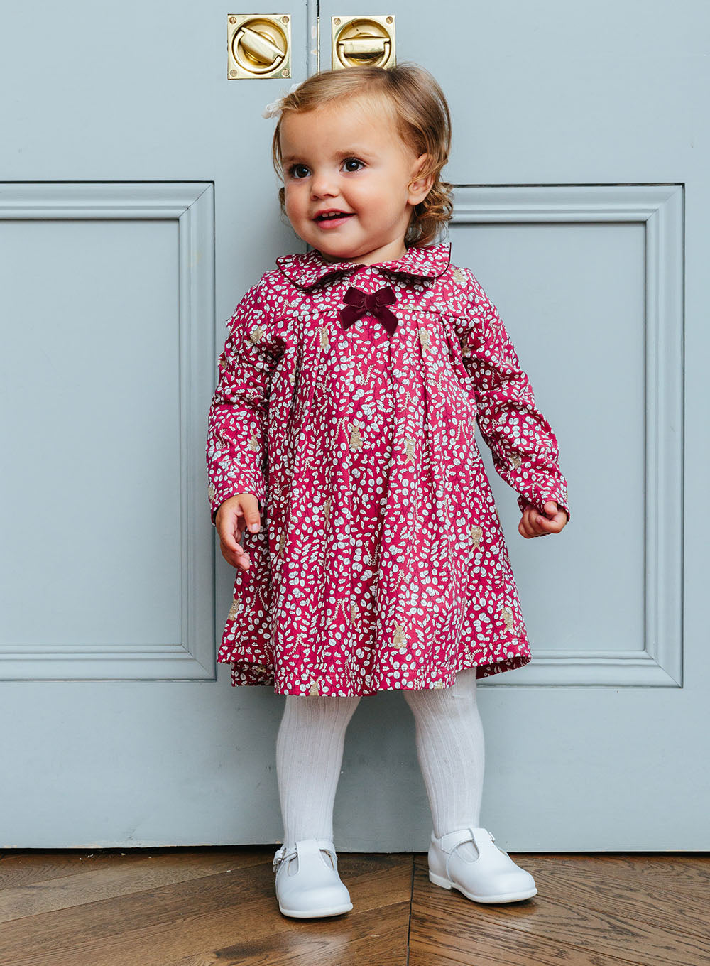 This enchanting dress is made in a beautifully soft cotton jersey fabric. Featuring a sweet woodland bunny design, it comes complete with long sleeves, velvet bow detailing and white woven petal collar. Fully lined, this dress is perfect for everyday wear or any smart/casual occasions.