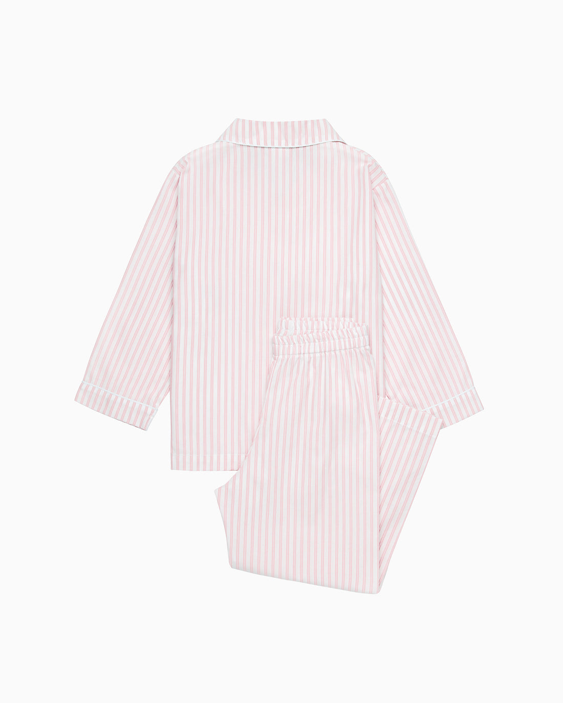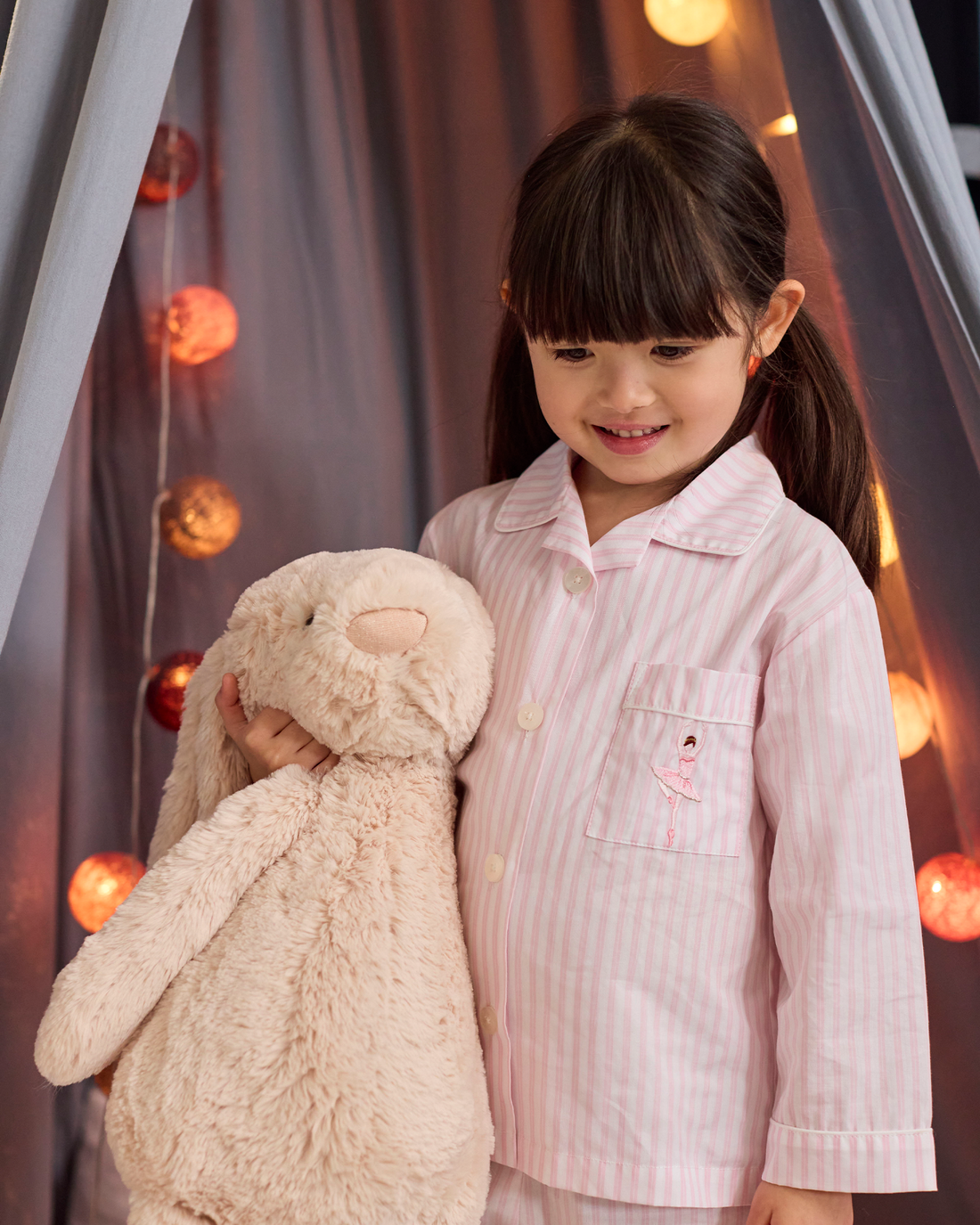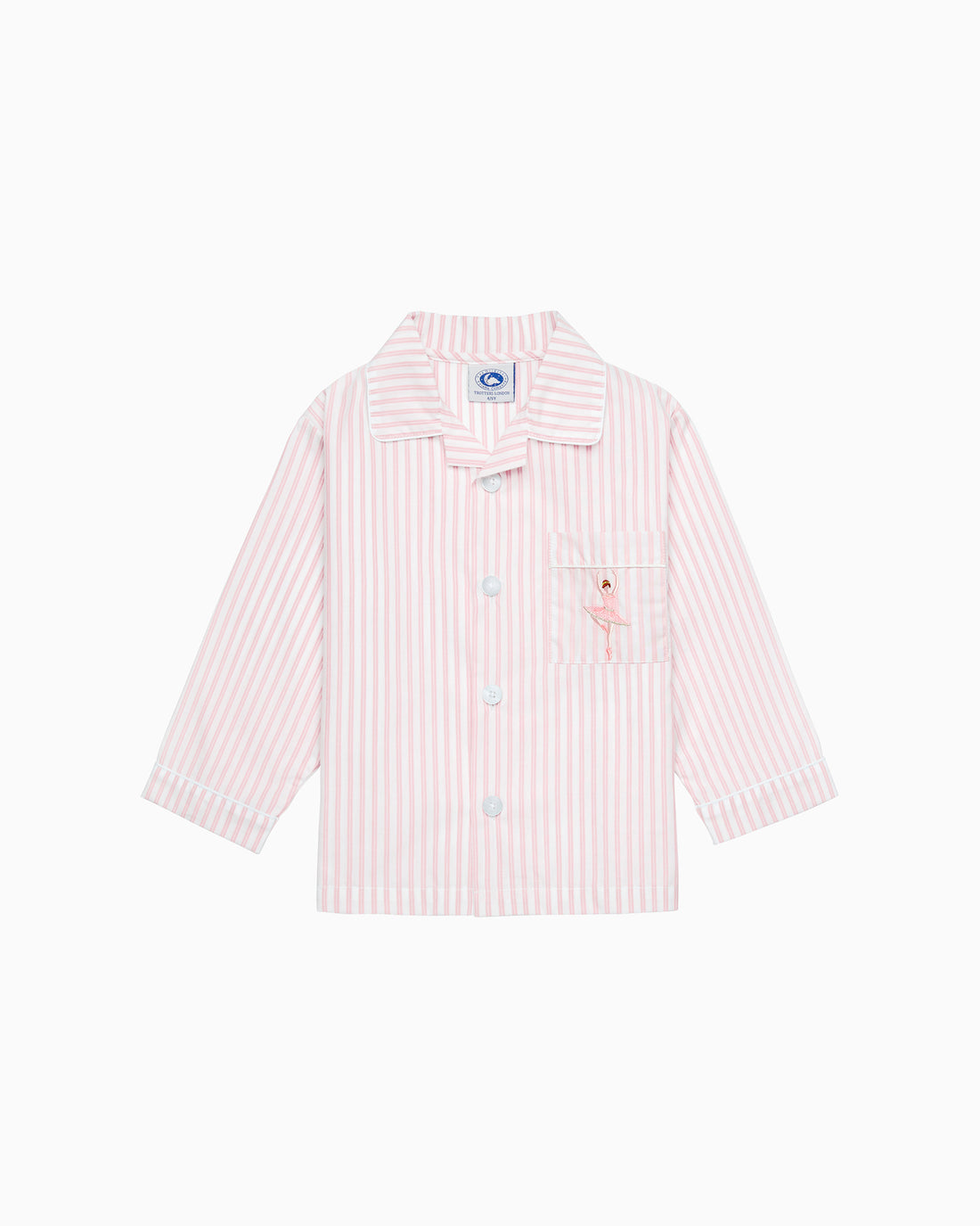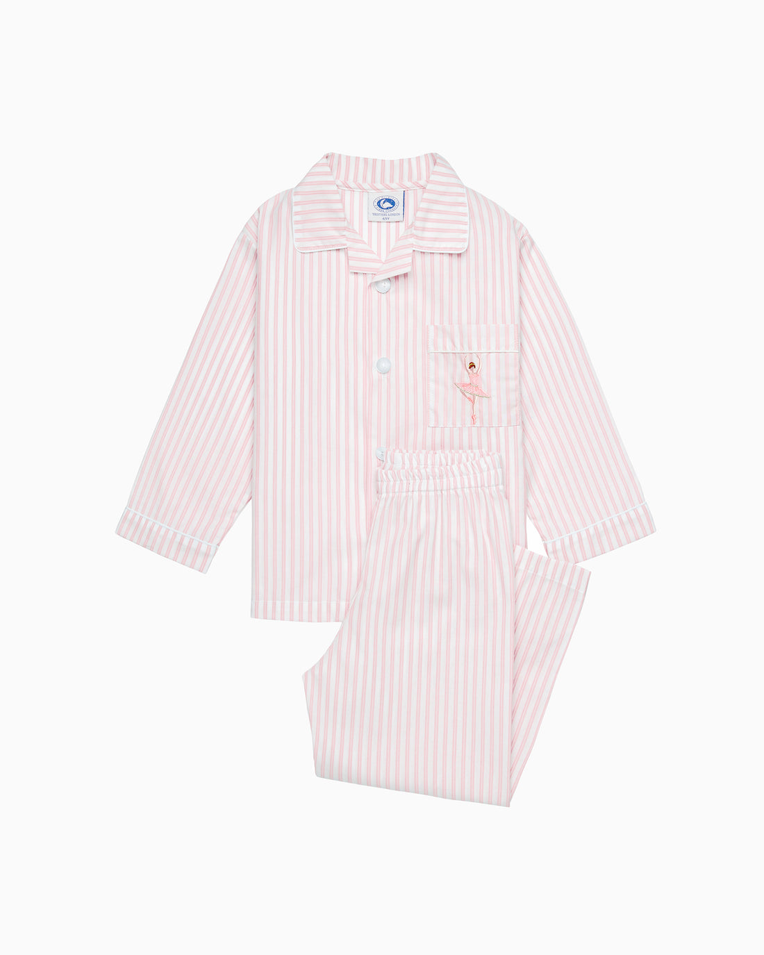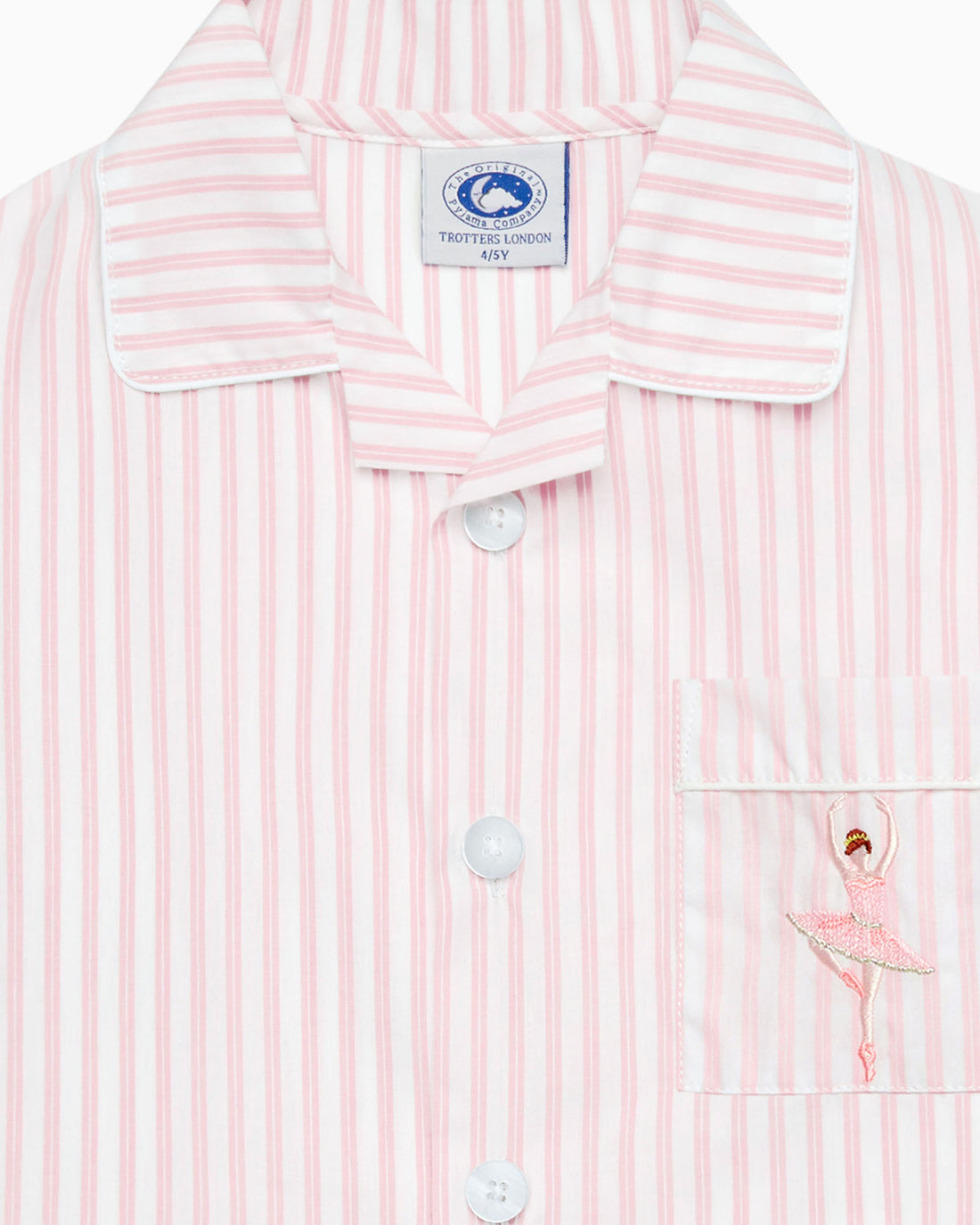 Made from 100% lightweight cotton, these pajamas are made in a pale pink stripe and come with long sleeves complete with white piping detailing. They're fastened with a pearlized button down front and showcase a pretty ballerina design embroidered on the chest pocket. The pants have a fully elasticated waist and are just the thing for sweet dreams and a comfortable night's sleep.