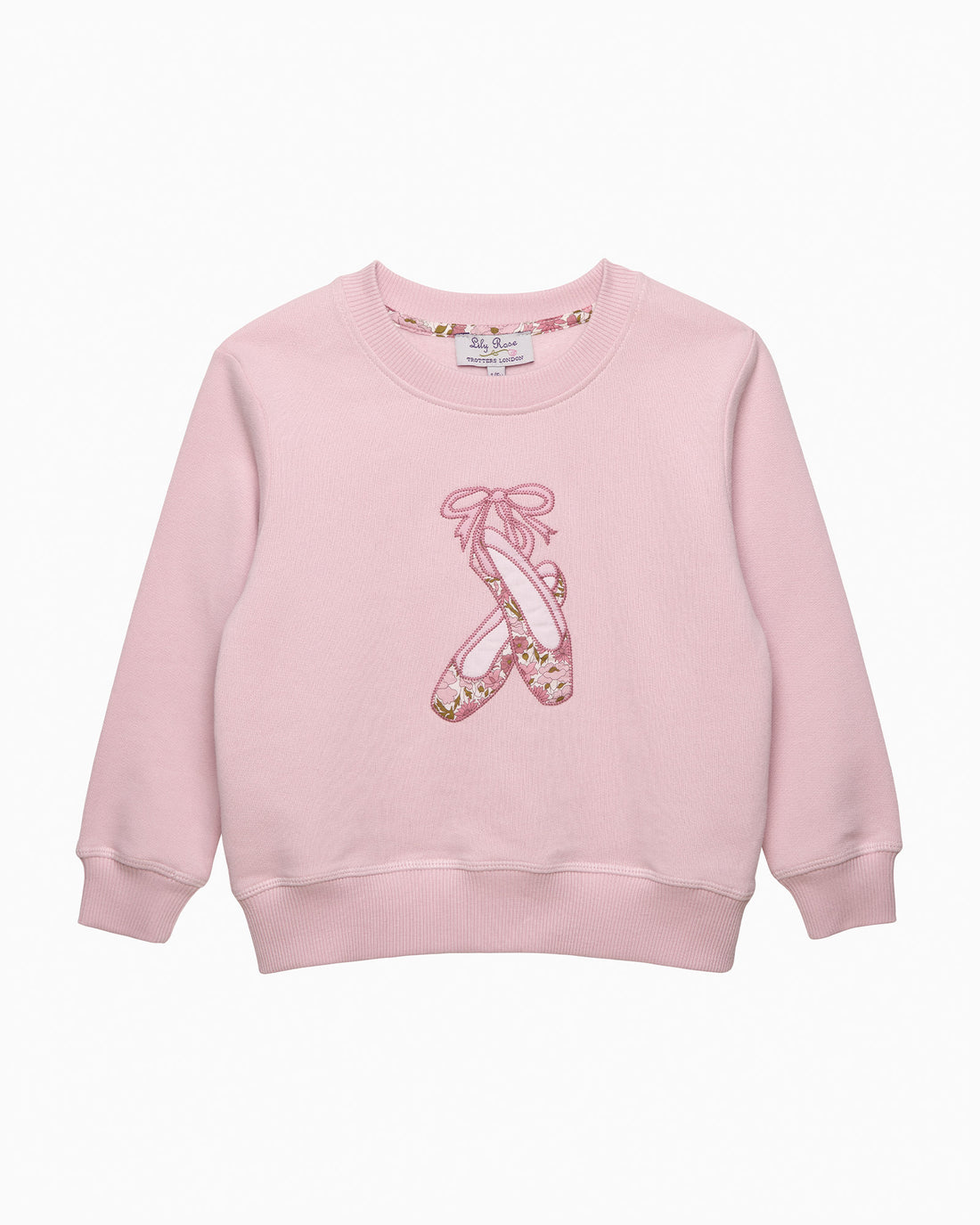 This more relaxed sweatshirt for girls comes in a pink colorway and features a statement appliqué ballet shoes design on the front made in Liberty's beautiful Poppy and Daisy print fabric which was designed for Liberty by the Jack Prince Studio in 1974. Made in a super soft jersey with tonal fleece underside and elasticated cuffs and hem, this makes a great go-to layer for everyday dressing.