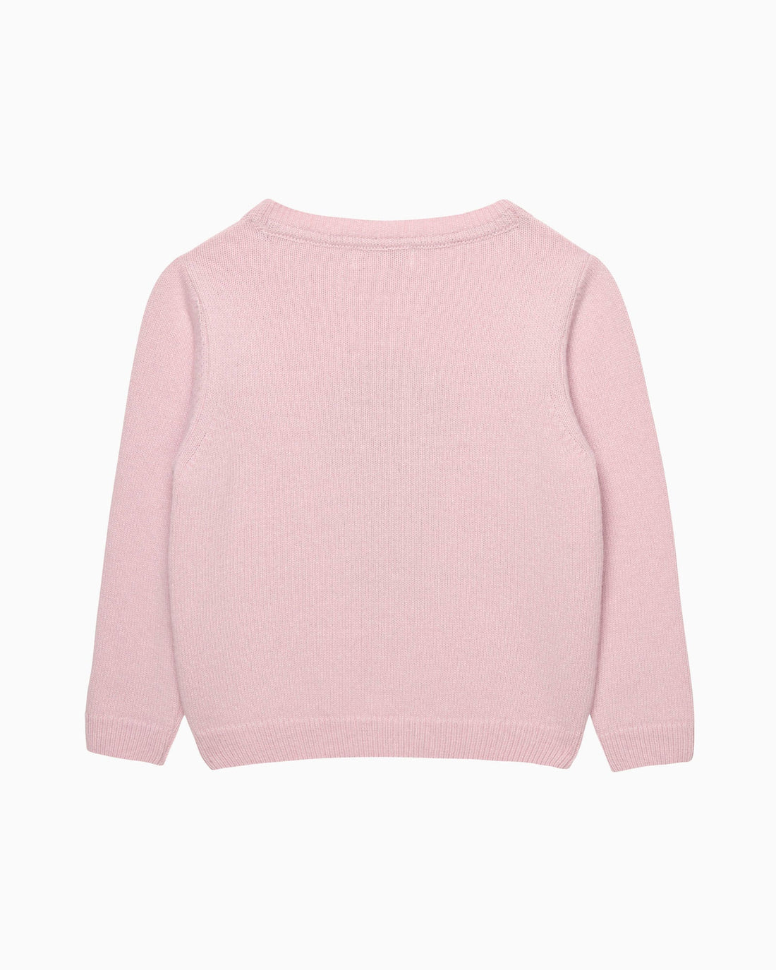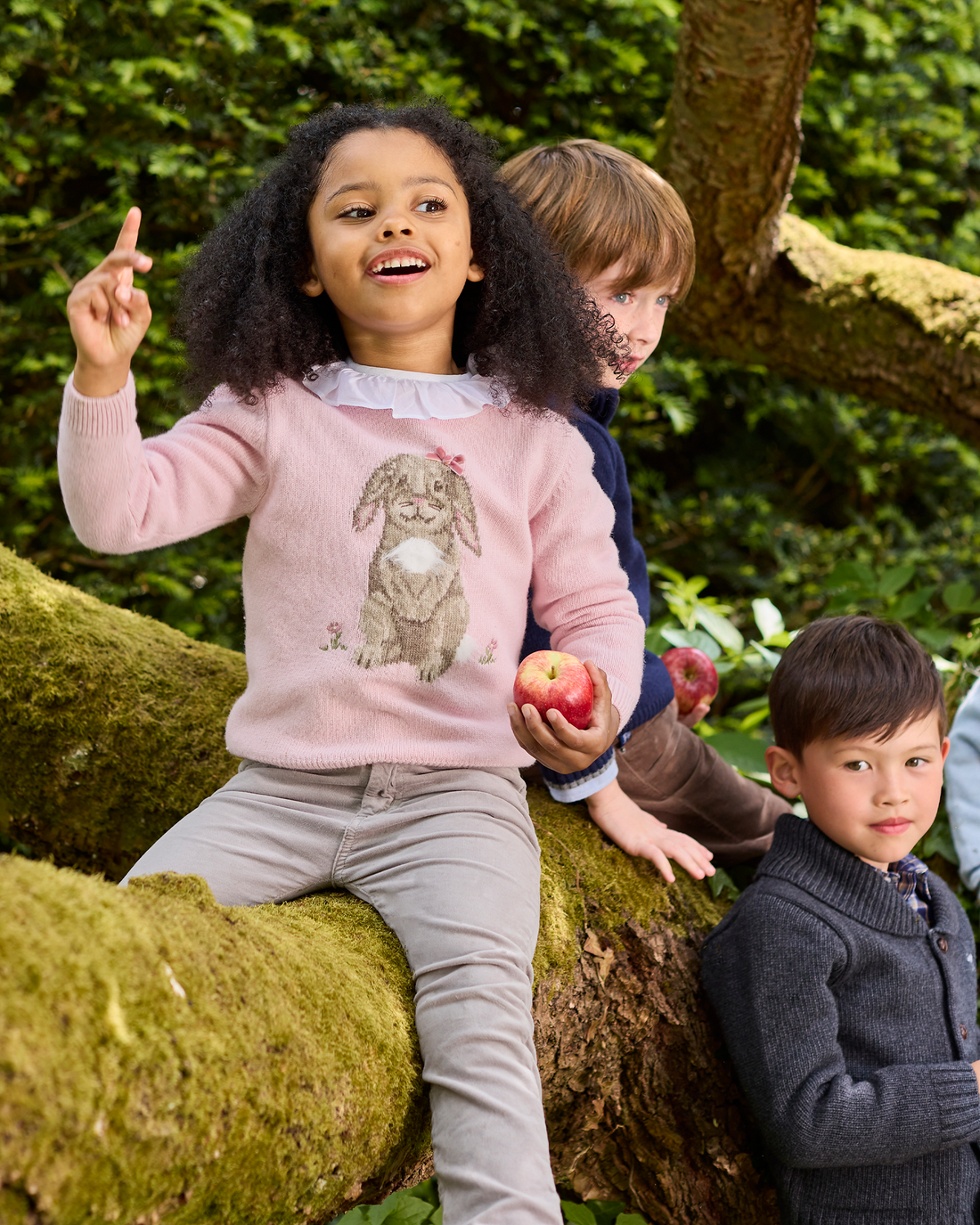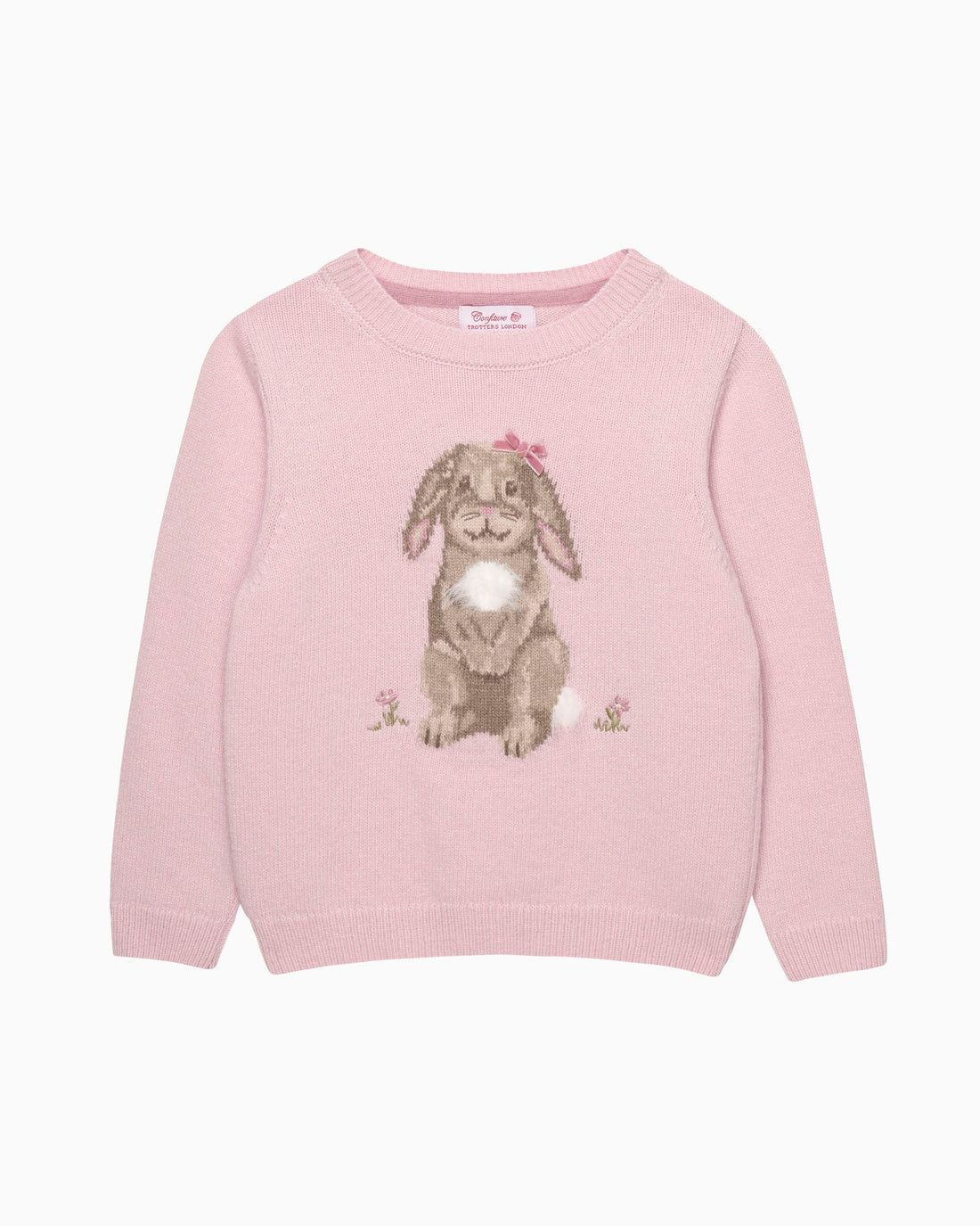 This sweet, pale pink sweater features a beautifully detailed intarsia bunny design on the front, completed with pink velvet bow detailing. Incorporating a tonal palette of creams and browns it features subtle textured faux fur detail which truly brings this bunny to life. Ideal for layering when the weather gets colder, it makes every outfit special.