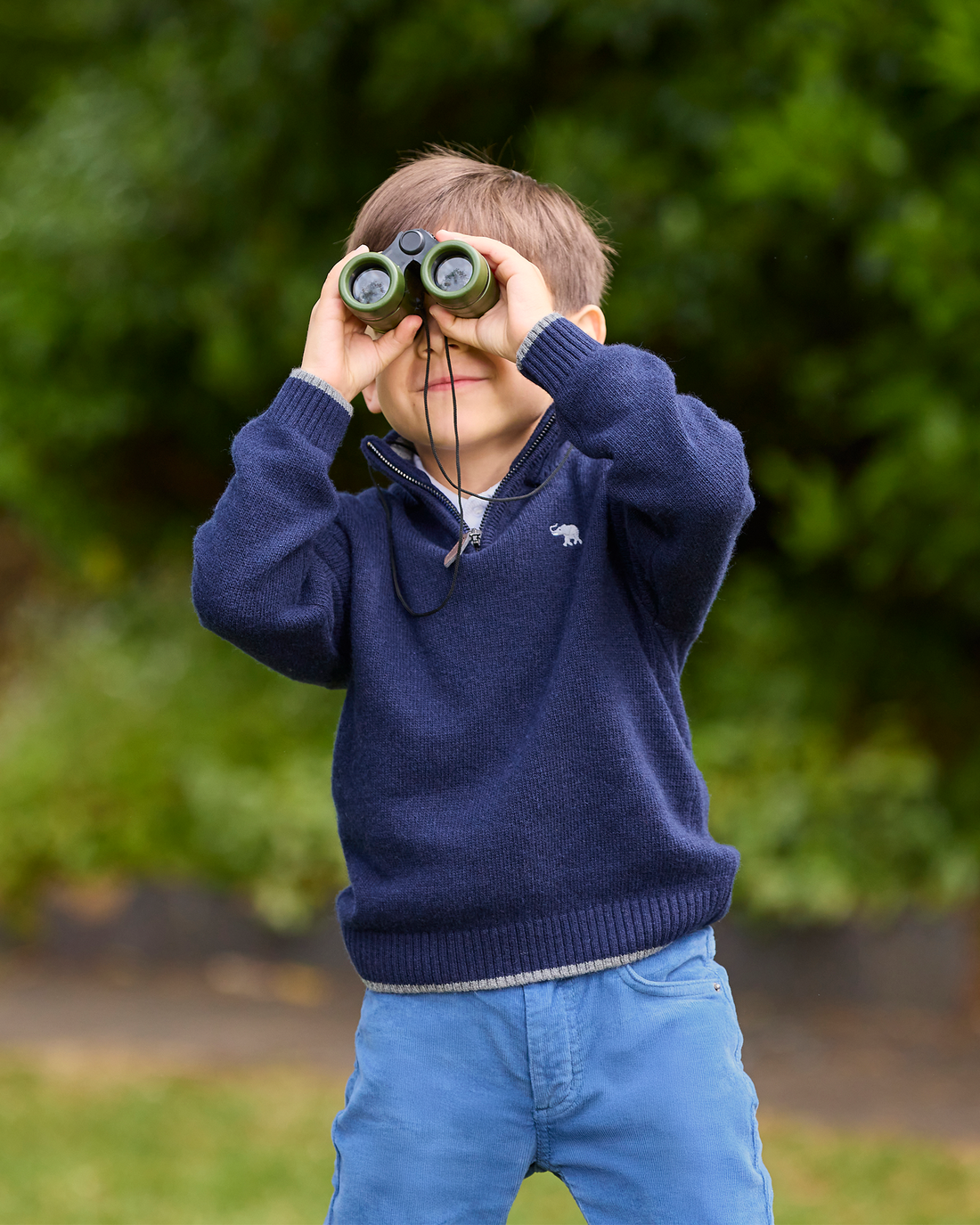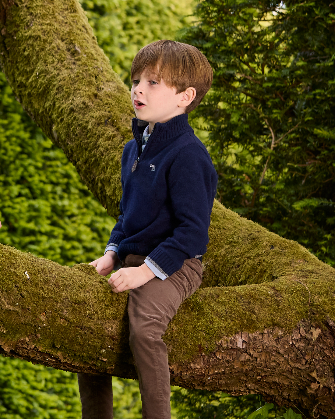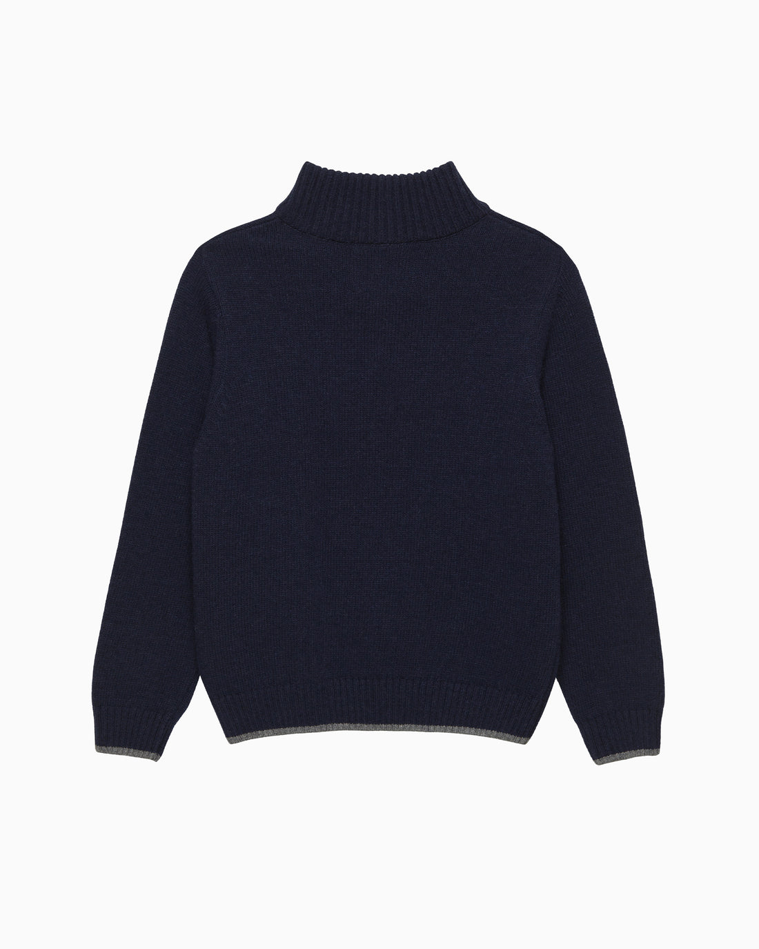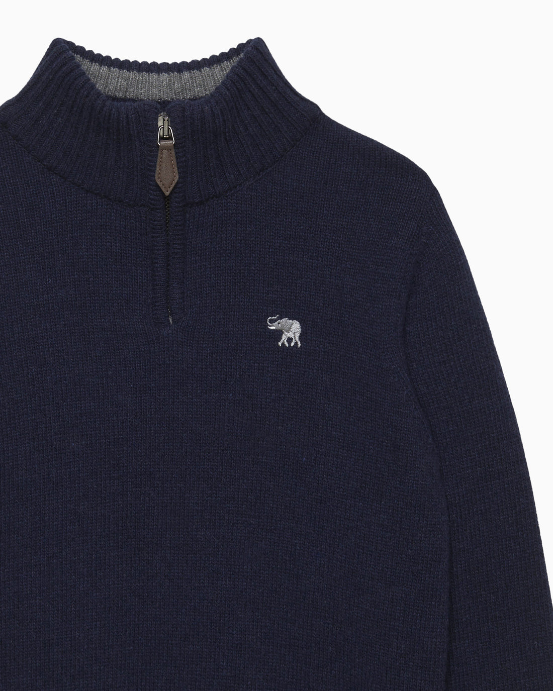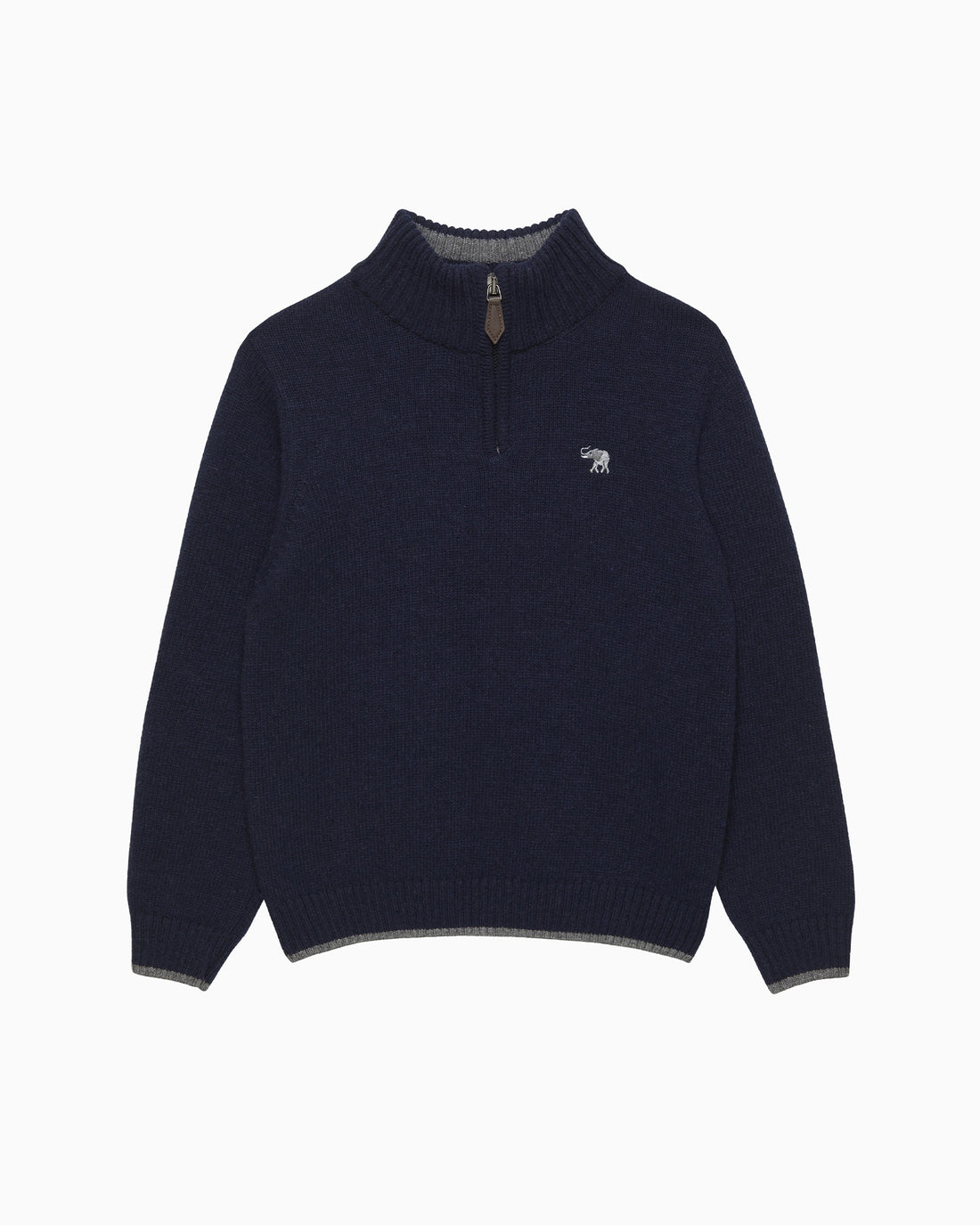 This stylish cashmere mix sweater is great for layering on those cooler evenings and features a practical half-zip which makes it comfortable and easy to slip on. Made in a classic navy knit with smart elephant embroidery on the chest, it features details of grey around the neck, hem and cuffs. This is bound to be your go to sweater this season.