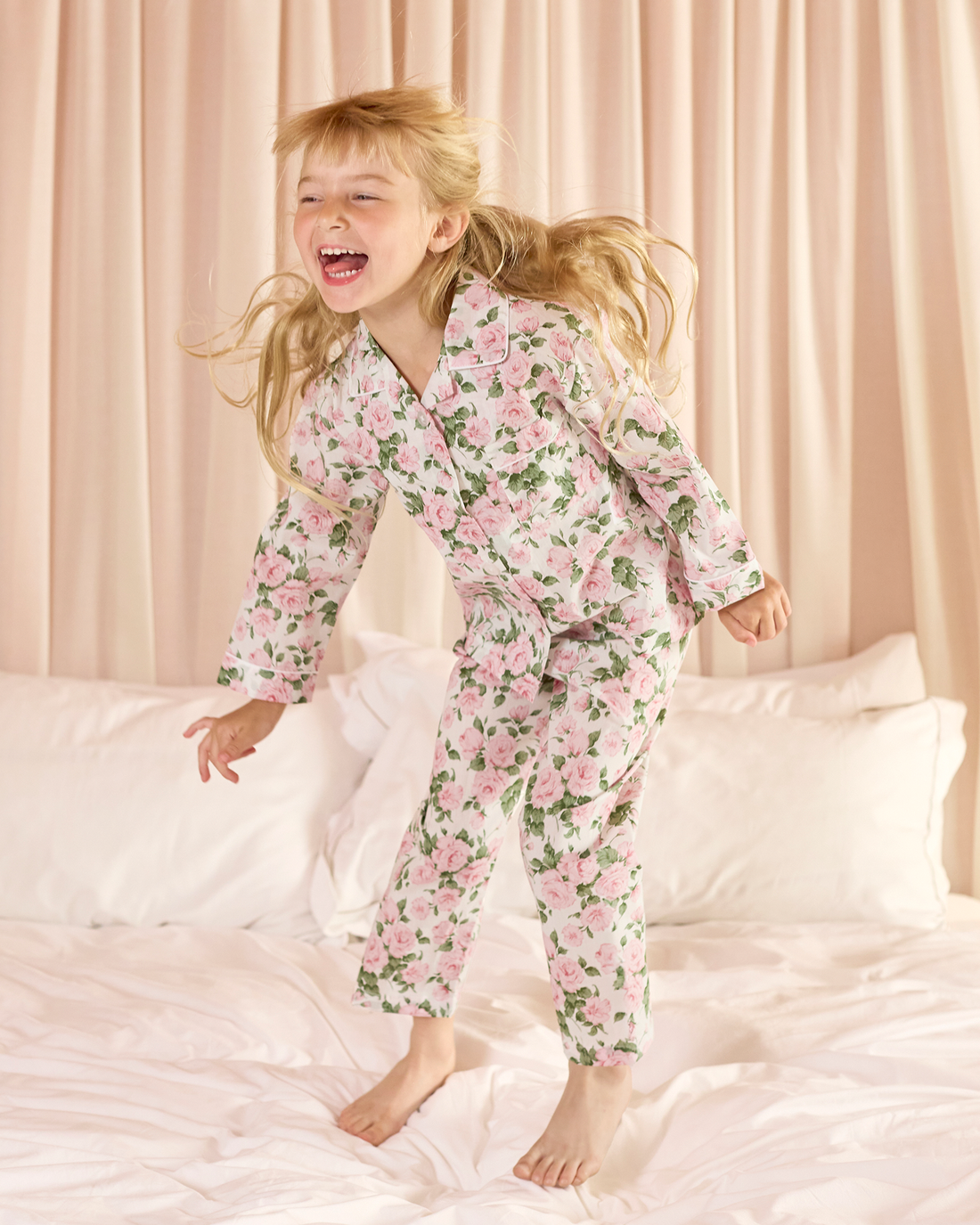 Made in Liberty's Carline print fabric, a beautiful rose floral design dates from the 90s, these pyjamas feature a classic collar and white piping detailing, while the trousers have a fully elasticated waist and are just the thing for sweet dreams and a comfortable night's sleep.