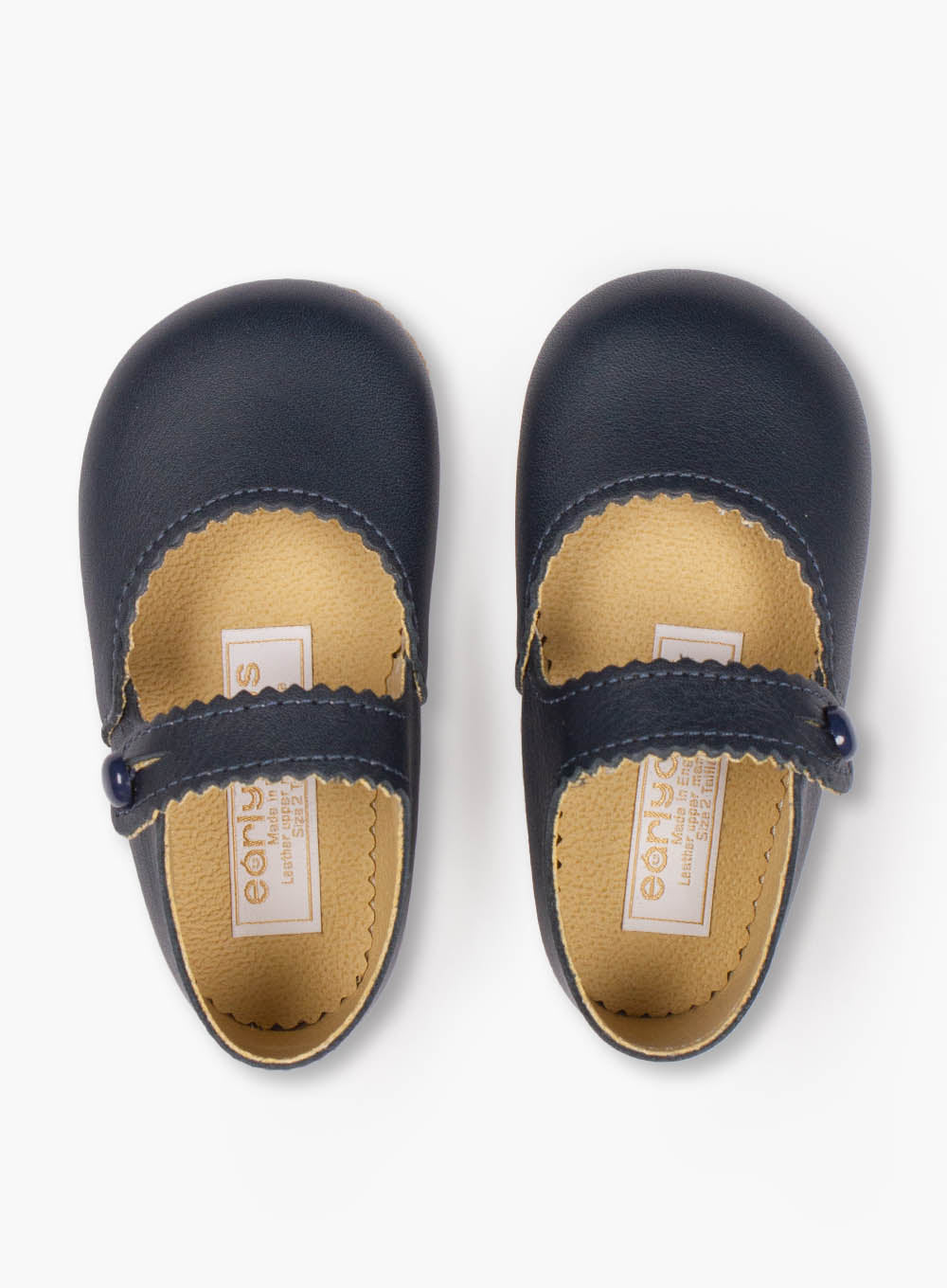 Our Early Days Emma pre-walkers are perfect for little feet, offering protection, comfort and style. Featuring a delicate Mary Jane strap finished with pinking shears for a zig-zag edge detail, fastened with a button and made from buttery soft Italian leather with a durable soft, breathable sole.Size Guide:EU 17/UK 1 = 3 - 6mthsEU 18/UK 2 = 6 - 12mthsEU 19/UK 3 = 12 - 18mthsEU 20/UK 4 = 18 - 24mths