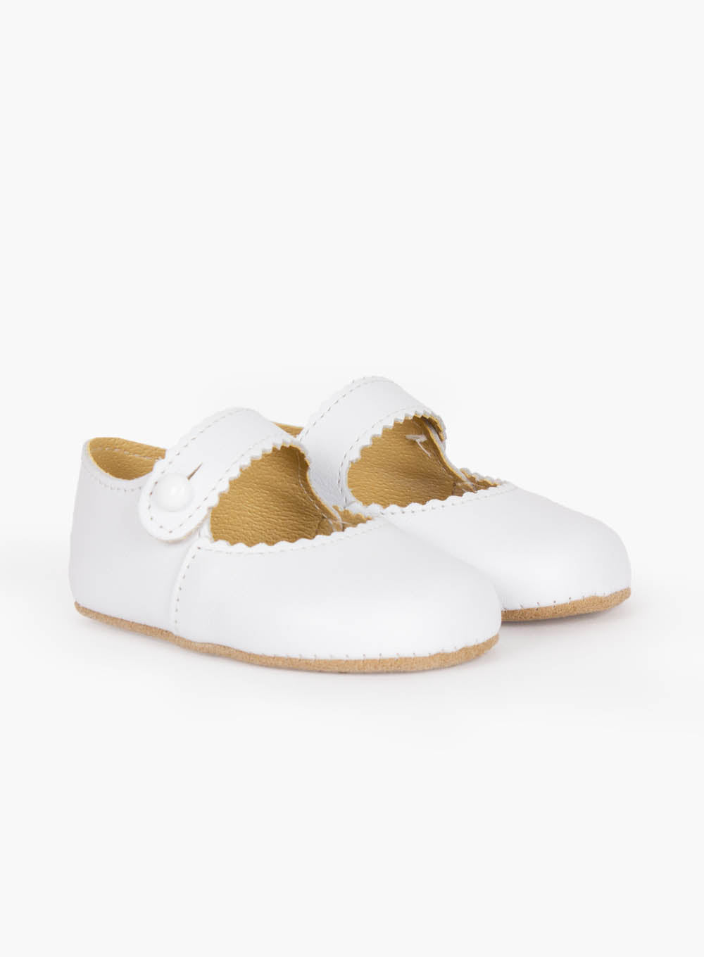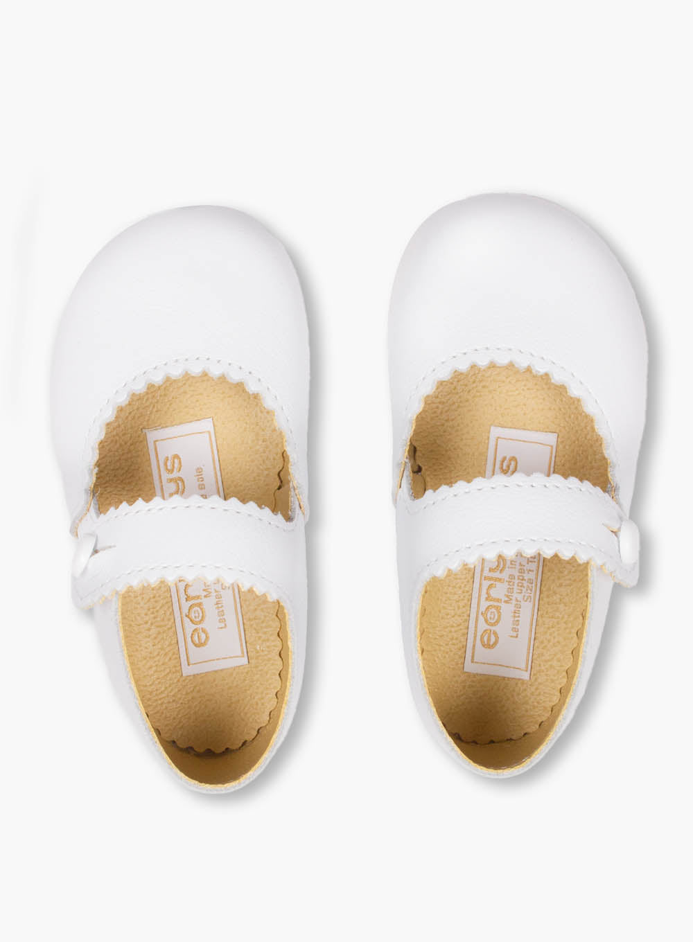 Our Early Days Emma pre-walkers are perfect for little feet, offering protection, comfort and style. Featuring a delicate Mary Jane strap finished with pinking shears for a zig-zag edge detail, fastened with a button and made from buttery soft Italian leather with a durable soft, breathable sole.Size Guide:EU 17/UK 1 = 3 - 6mthsEU 18/UK 2 = 6 - 12mthsEU 19/UK 3 = 12 - 18mthsEU 20/UK 4 = 18 - 24mths