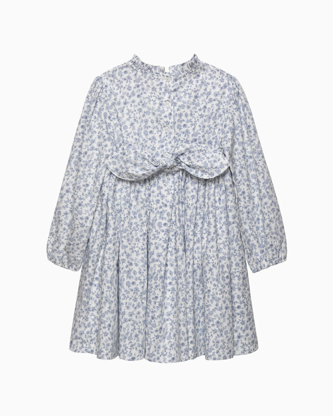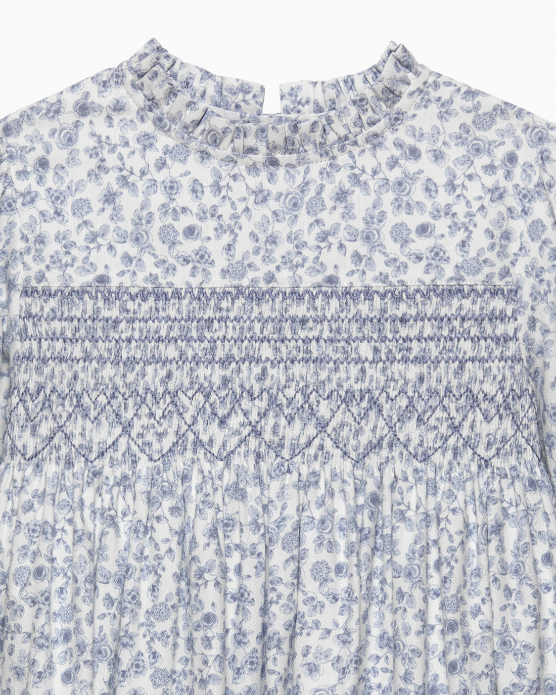 Our Edie dress comes in a beautiful all-over miniature floral print, in hues of blues and features a smart smocked panel across the front, complete with complimentary embroidered detailing. Finished off with long sleeves and a delicate frill collar, this makes a great transitional piece as the weather starts to get fresher.