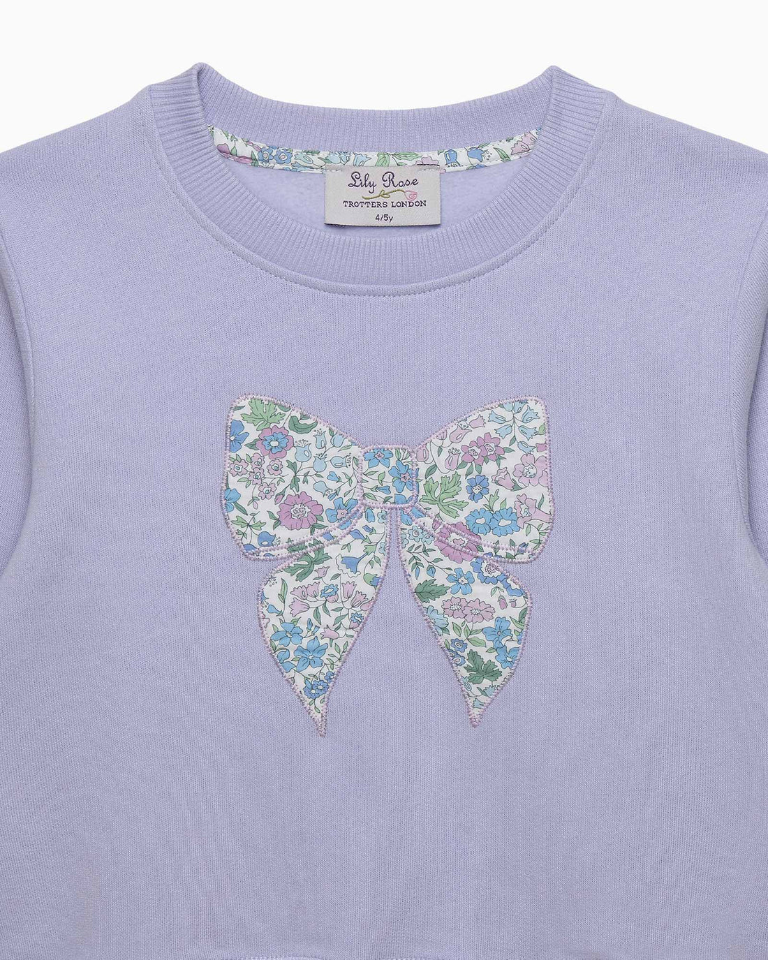 This more relaxed sweatshirt for girls comes in a fresh lilac colorway and features a statement appliqué bow design on the front in Liberty's Emma Amelia print fabric, a sister print to Emma Bloom that embraces Liberty’s classic floral style. Made in a super soft jersey with elasticated cuffs and hem, this makes a great go-to layer for everyday dressing.
