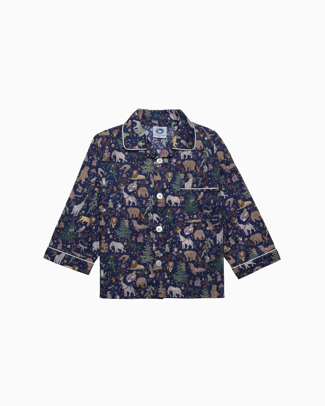 Made in this seasonal print fabric from Liberty, it's full of all of the fun and magic of Christmas. Inspired by the Liberty London store interior, there are a host of animals busily preparing for the festive season. Fastened with a pearlised button down front, and featuring a classic chest pocket and contrasting white piping, the trousers have a fully elasticated waist and are just the thing for sweet dreams and a comfortable night's sleep.