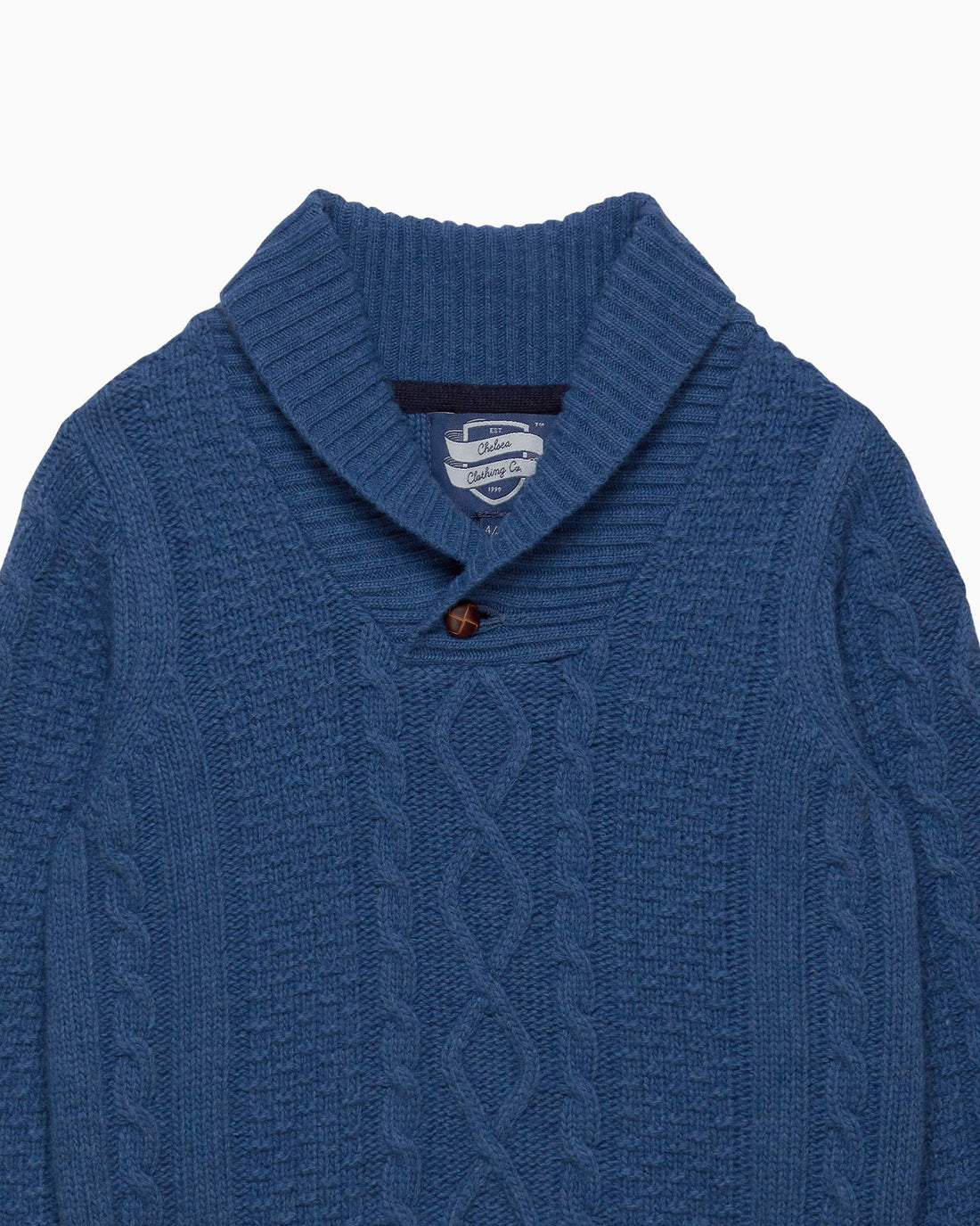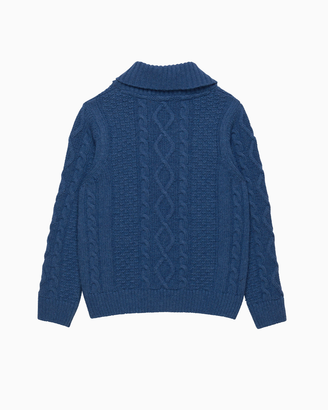 This sweet yet practical sweater is made in warm and soft cashmere mix and comes in a classic and versatile denim blue marl color. Including the fun addition of a shawl collar and functional, mock leather button fastening, this cable knit sweater makes the perfect layer for cooler days and evenings.