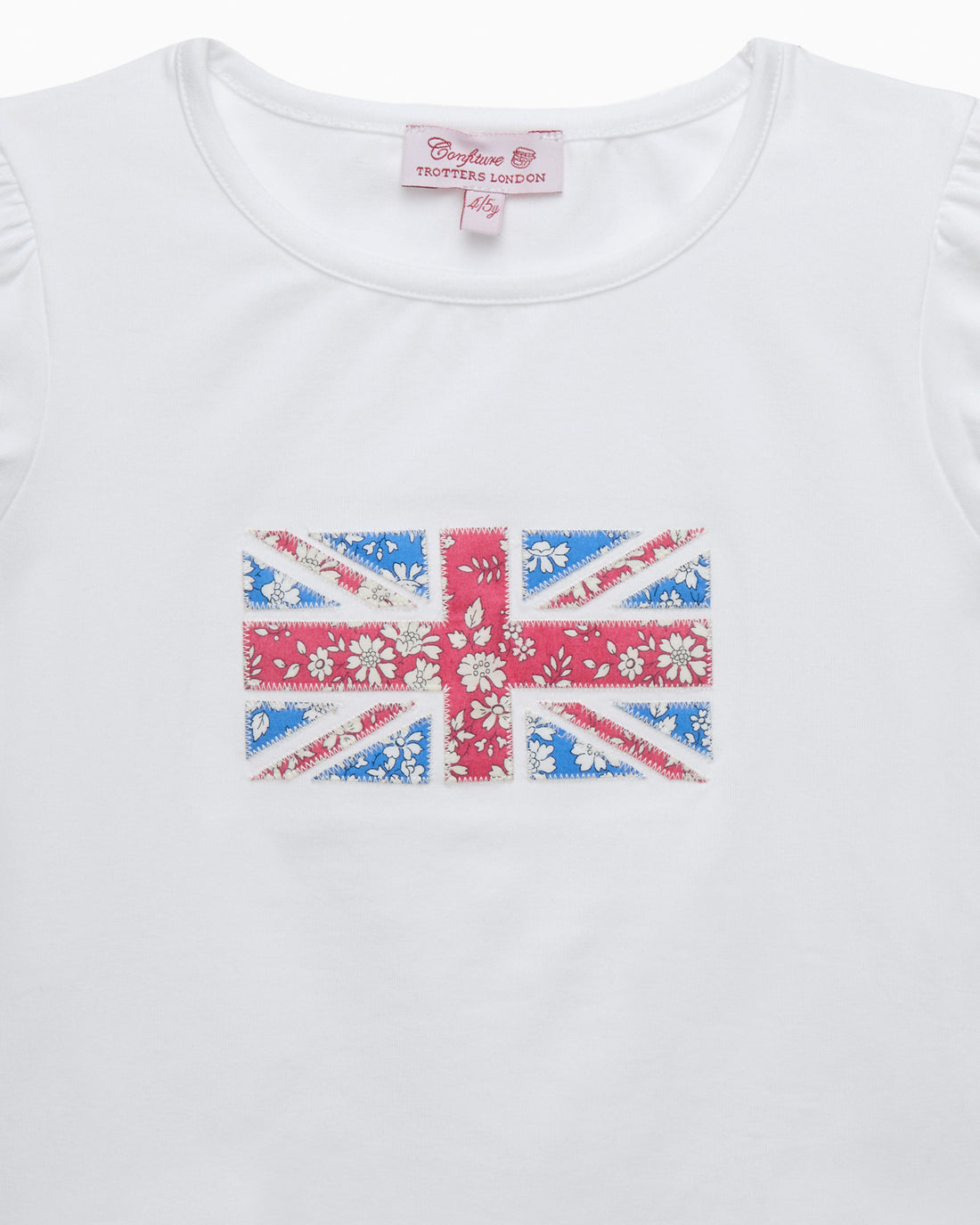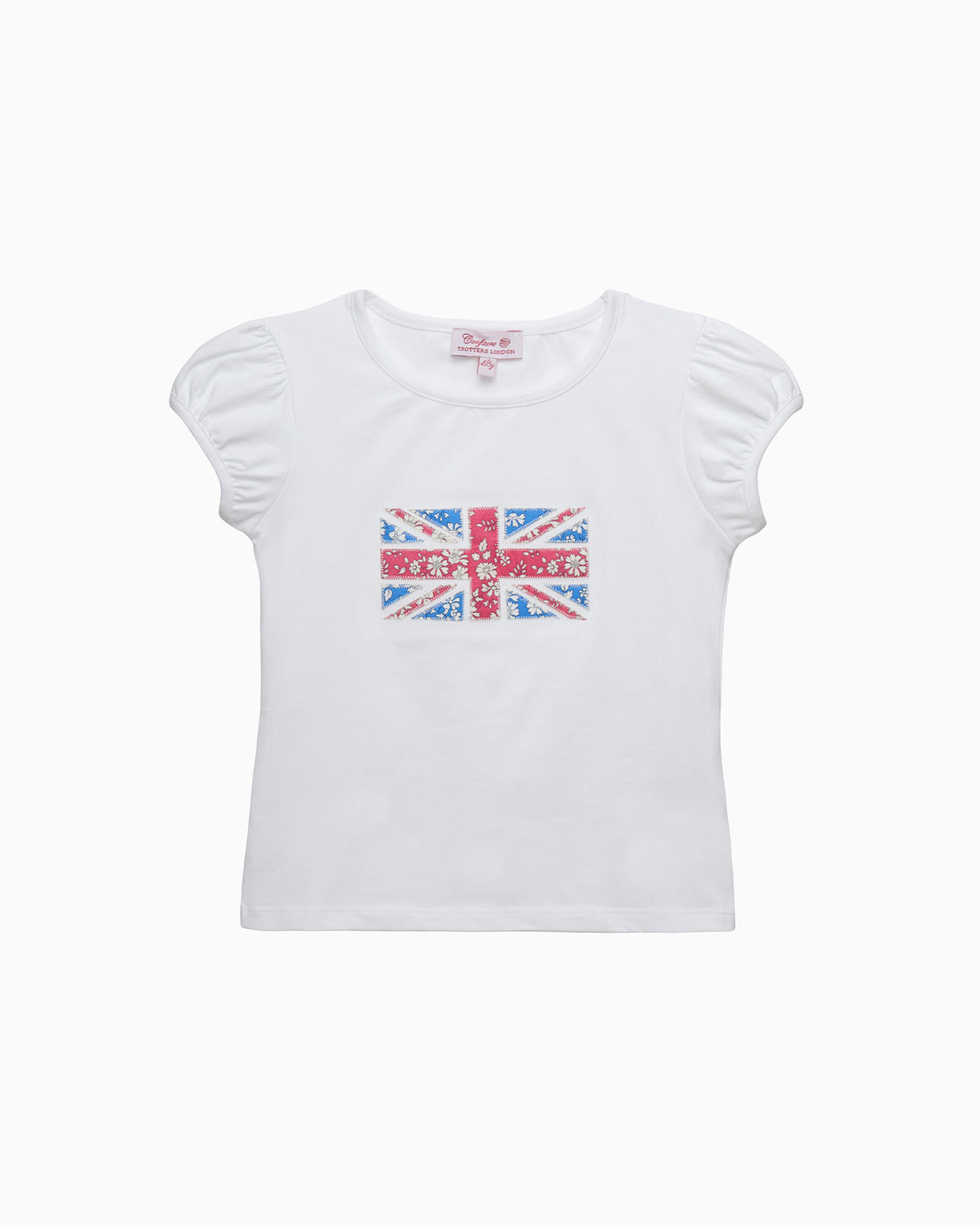 Now you can fly that flag with a floral twist with this beautiful adaptation on a wardrobe staple. Featuring an appliqué Union Jack on the front made in a combination of Liberty's pink and blue Capel print fabric, this will add a fun touch of patriotic pride to any outfit. Cotton-rich, this lovely white t-shirt with puff sleeves is both comfortable and versatile.