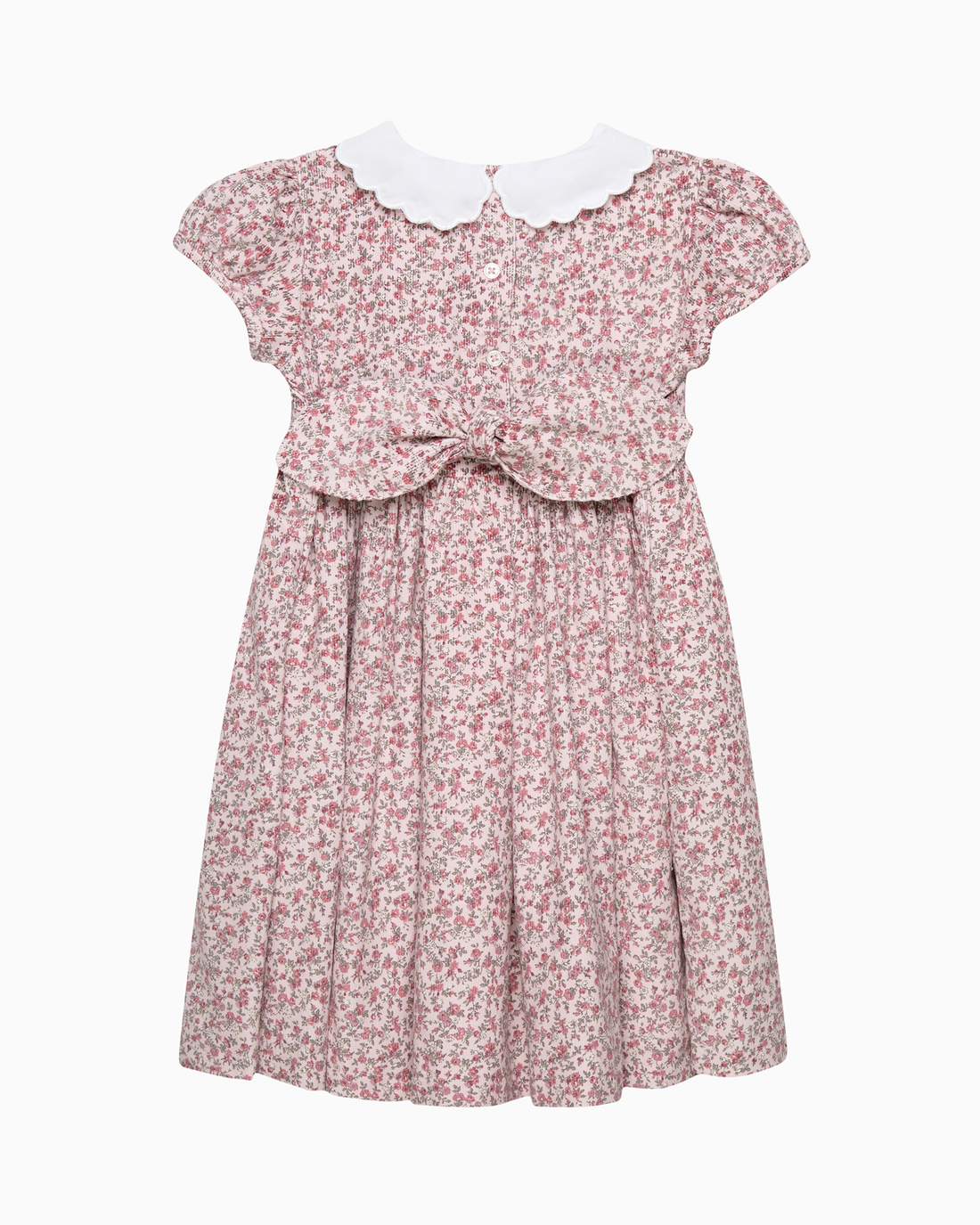 Made in a fine floral needlecord, this dress features a smart contrasting white scalloped petal collar and our signature appliqué ducks waddling along the bottom, complete with complementary bows. Fully lined with pretty puff sleeves, it's perfect for parties!