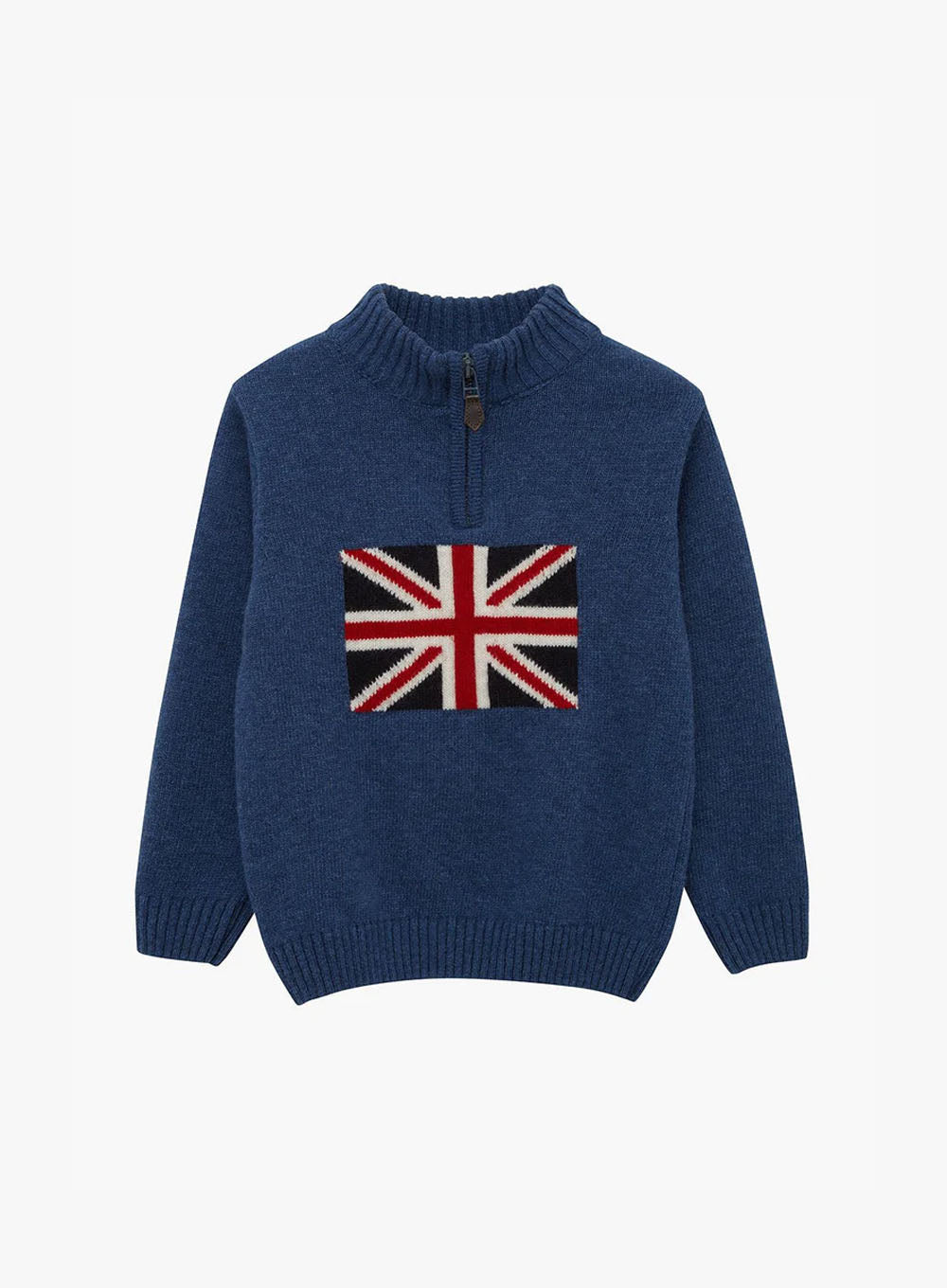 Fit for a Prince and new to Trotters this season, this stylish wool mix sweater is great for layering on those colder evenings. Featuring our iconic Union Jack intarsia on the front, it also has a practical half-zip with mock leather pull which makes it both comfortable and easy to slip on.