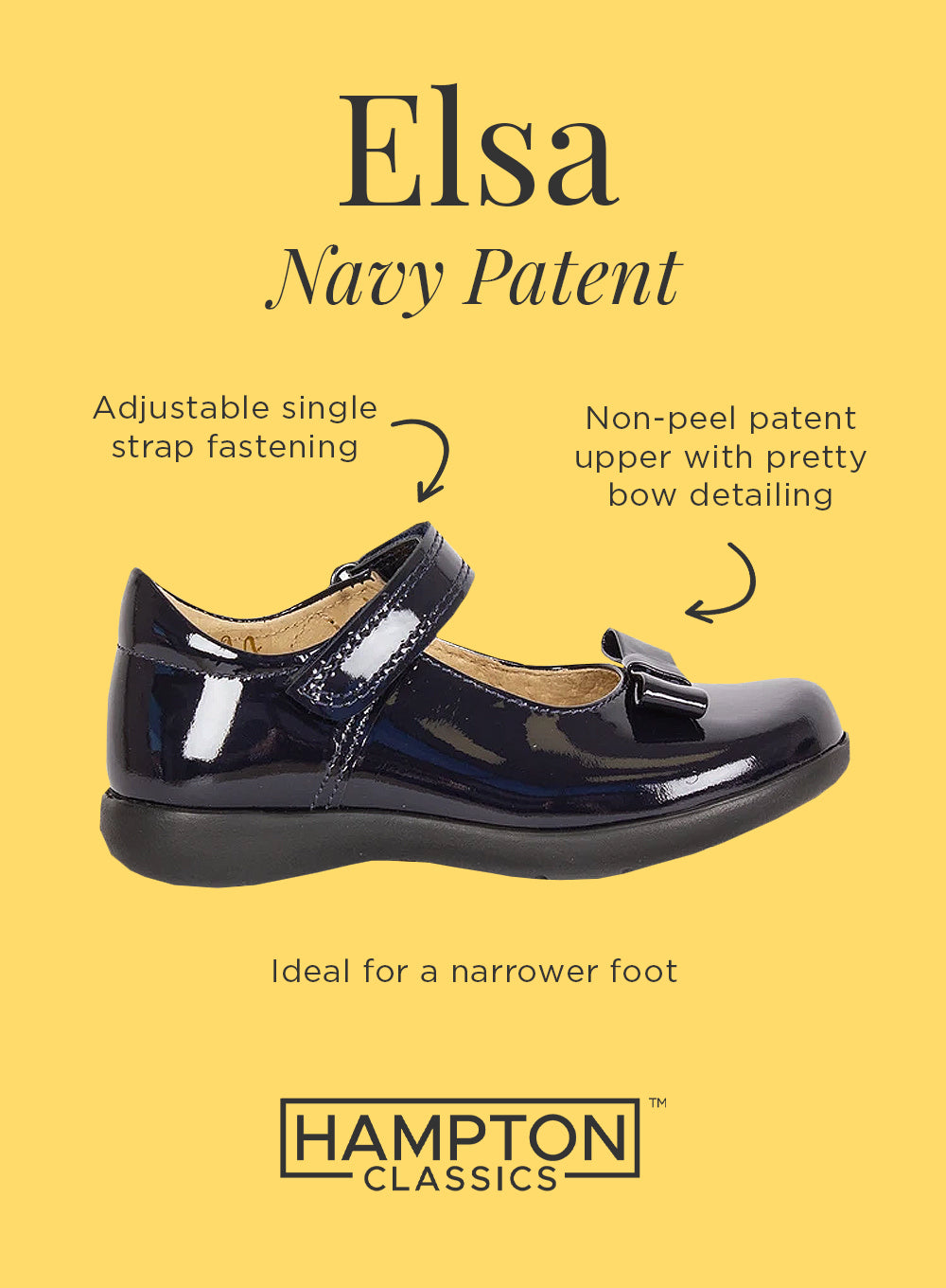 These are the perfect shoes for any little girl with a narrower foot. They feature an adjustable single strap fastening for a comfortable fit while the soft heel pad helps to protect young feet. Leather lined, they have a smart patent upper, rubber outsole and pretty bow detailing.