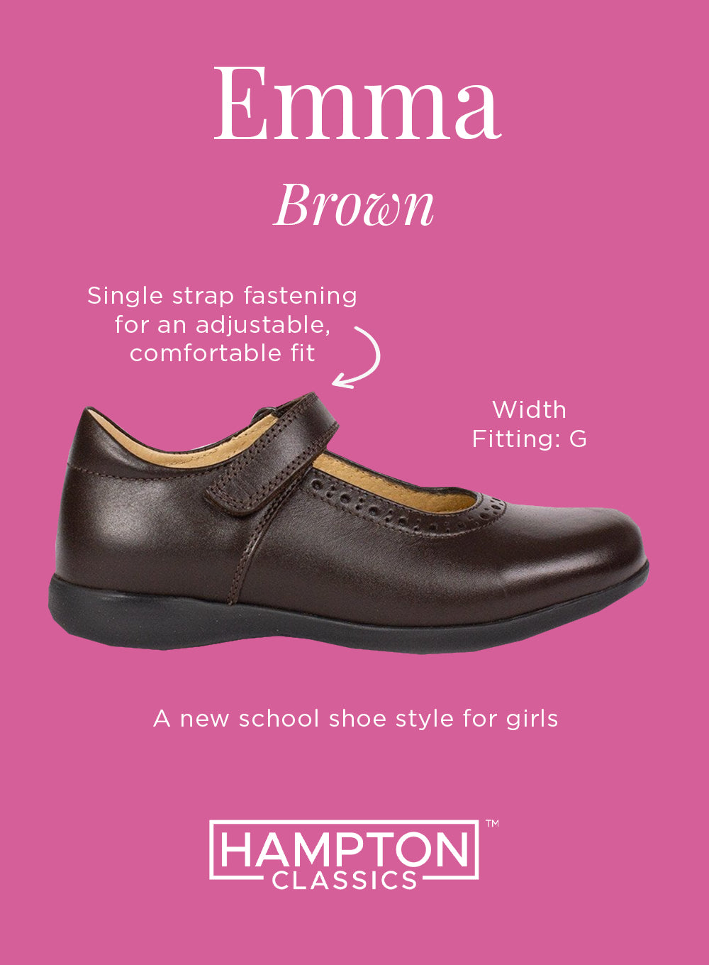 A new style this season, our Emma school shoe is  perfect for any  young  girl with a wide foot, and comes  complete with smart brogue detailing.  It features a single strap fastening for an adjustable and comfortable fit and a soft heel pad to support and protect little feet. They are made from 100% premium European durable leather and fully leather lined for comfort.