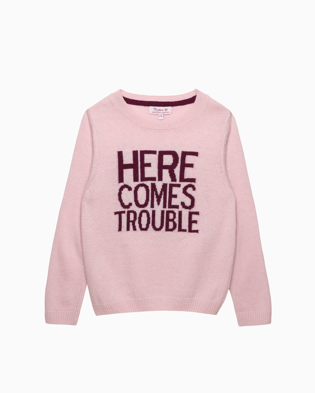 Our bestselling 'Here Comes Trouble' slogan sweater is made in a warm wool mix and is set against a pretty pink background. It features the intarsia slogan and showcases ribbed detailing along the neckline, cuffs and hem for a smart finish.