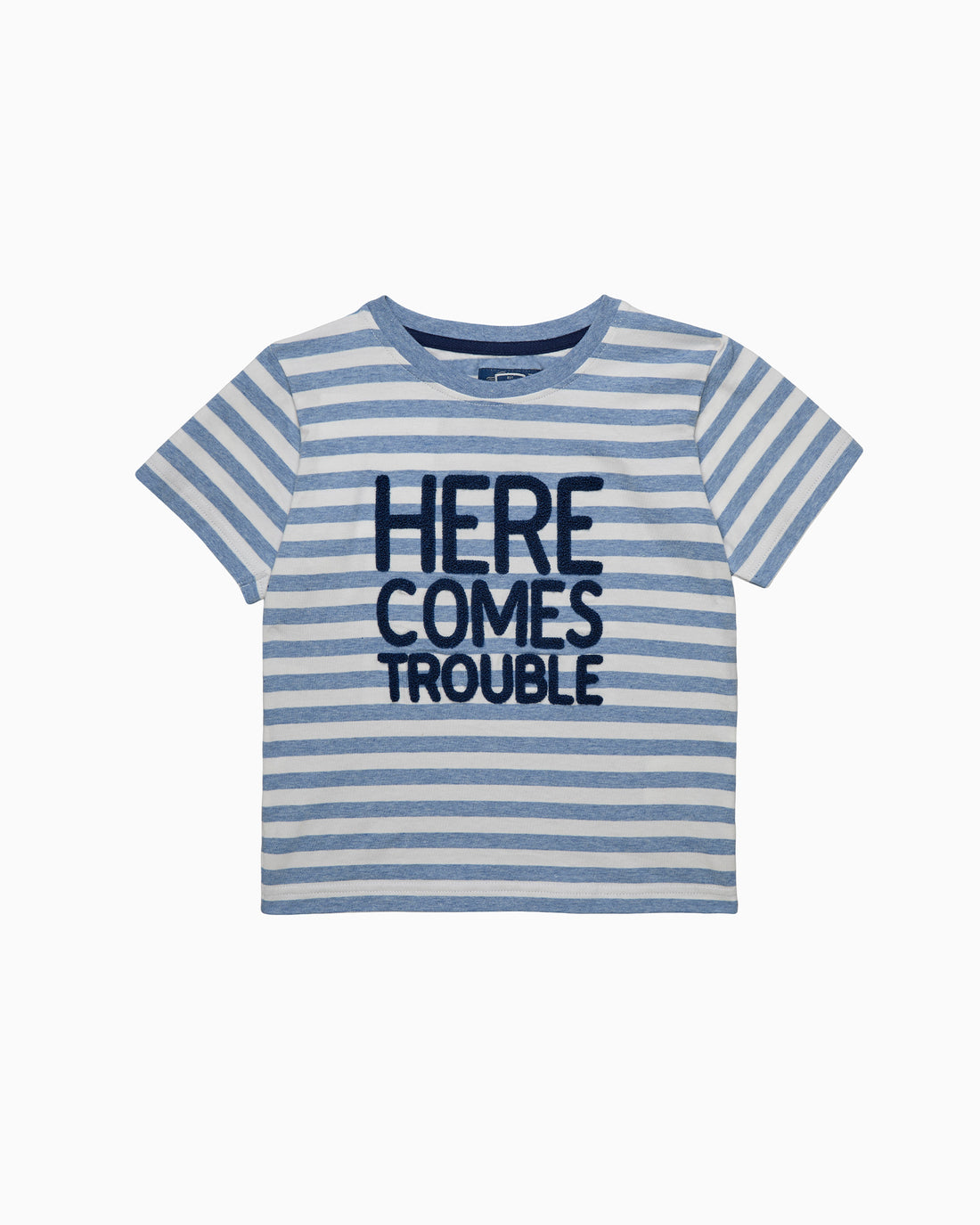 What better way to make your little troublemaker stand out from the crowd, than with our 'Here Comes Trouble' t-shirt. Made from 100% cotton, this classic blue and white striped top is completed with the addition of this dark blue bouclé slogan, front and center.