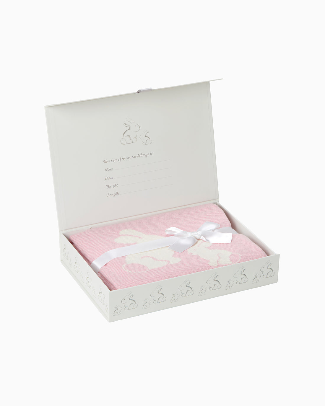 Presented in a keepsake gift box with grey grosgrain ribbon tie, it also features a sweet message inside - “This box of treasures belongs to…" - and makes a perfect present for any new arrival. Each blanket is finished with a white satin ribbon, ready for gifting.