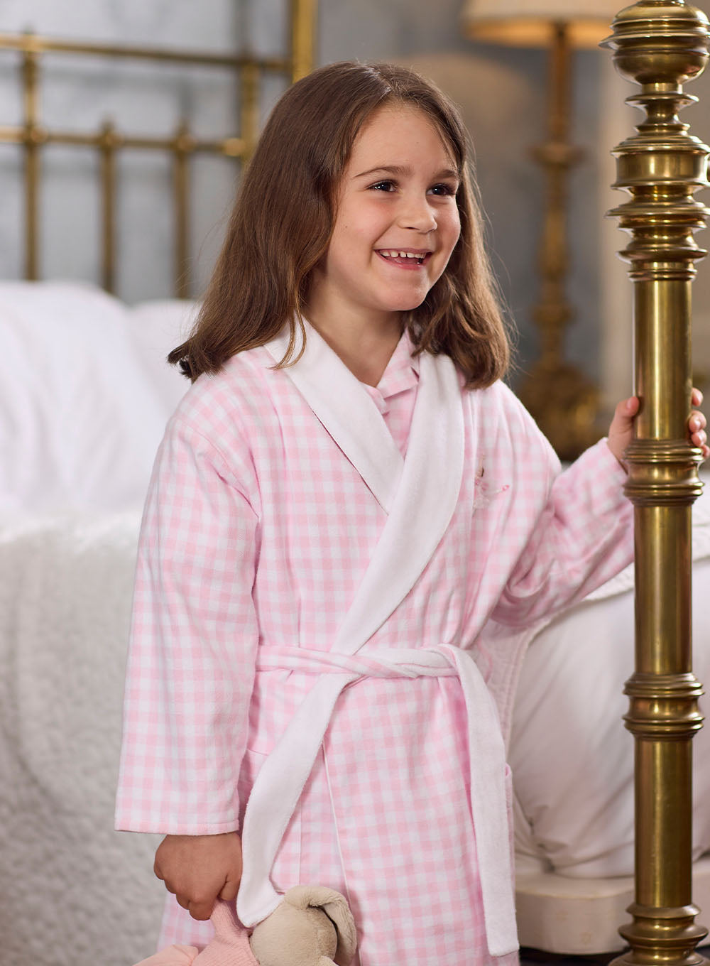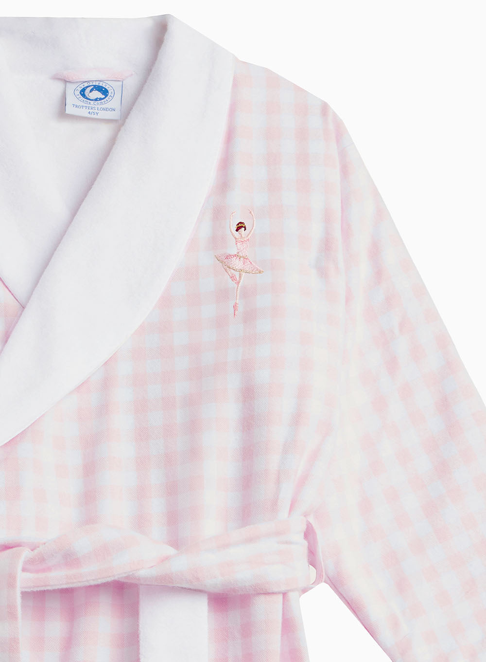 This soft, brushed cotton bathrobe comes in a pretty pink gingham fabric. It has a cozy toweling lining, perfect for snuggling up in on those cooler mornings and evenings. It also features our ballerina badge embroidered on the front, complete with white piping detail.Comes with matching belt cord & two patch pockets. Pair with our matching Margot Ballerina Pajamas for the full set.