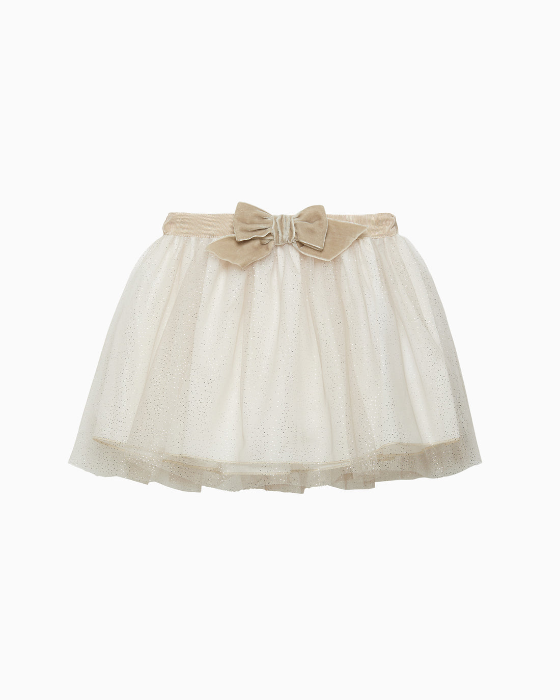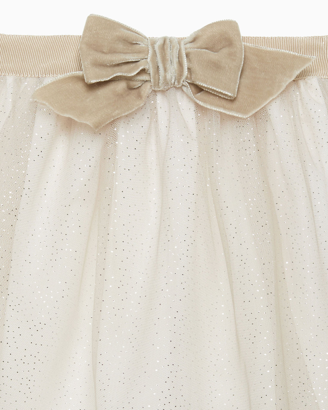 A whimsical twirl on elegance. A dreamlike design embellished with sparkling gold, this divinely crafted fairy skirt features a ethereal tulle overlay that will leave you feeling enchantingly graceful. Delicate taupe waistband and velvet bow offer effortless sophistication and luxurious comfort.