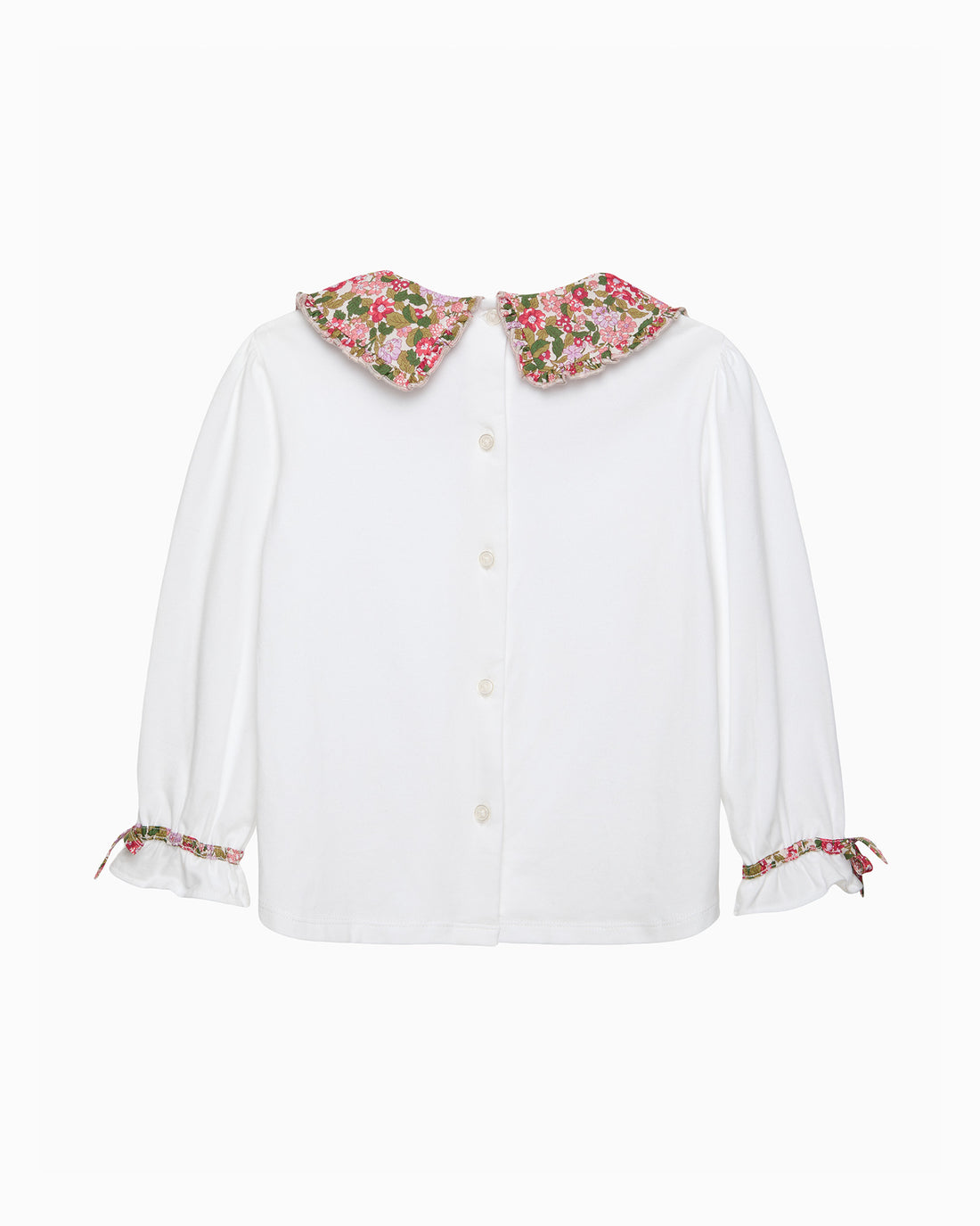 Our bestselling jersey blouse comes with a fun twist this season. Set against a classic white, it features a statement oversized pie crust collar made in Liberty's Hedgerow Ramble print fabric, a print which showcases blackberries and dense blooms in hues of pinks and greens. Complete with a full button-down back, it also showcases matching elasticated ties at the cuff to keep those sleeves in place. Perfect for pairing with pants and skirts for an easy day to day outfit.