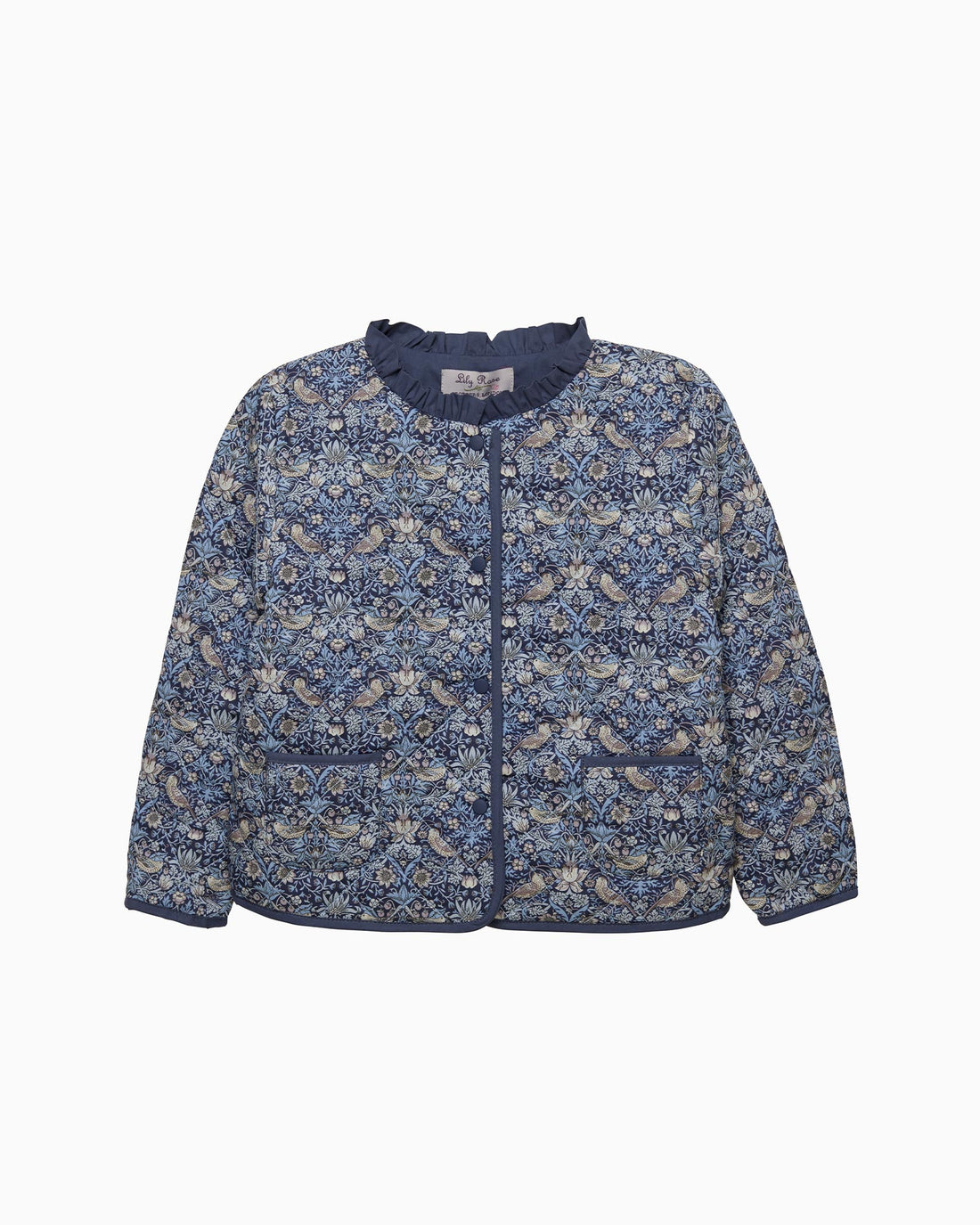 Why not inject a little charm into their wardrobe with our premium quilted jacket. Made from Liberty's Strawberry Thief print fabric, originally designed by William Morris in 1883, it features light padding, a classic diamond quilted effect and 2 side pockets. Lined in a smart navy, it will make a charming addition to their outerwear options and is sure to stand out on their coat peg.