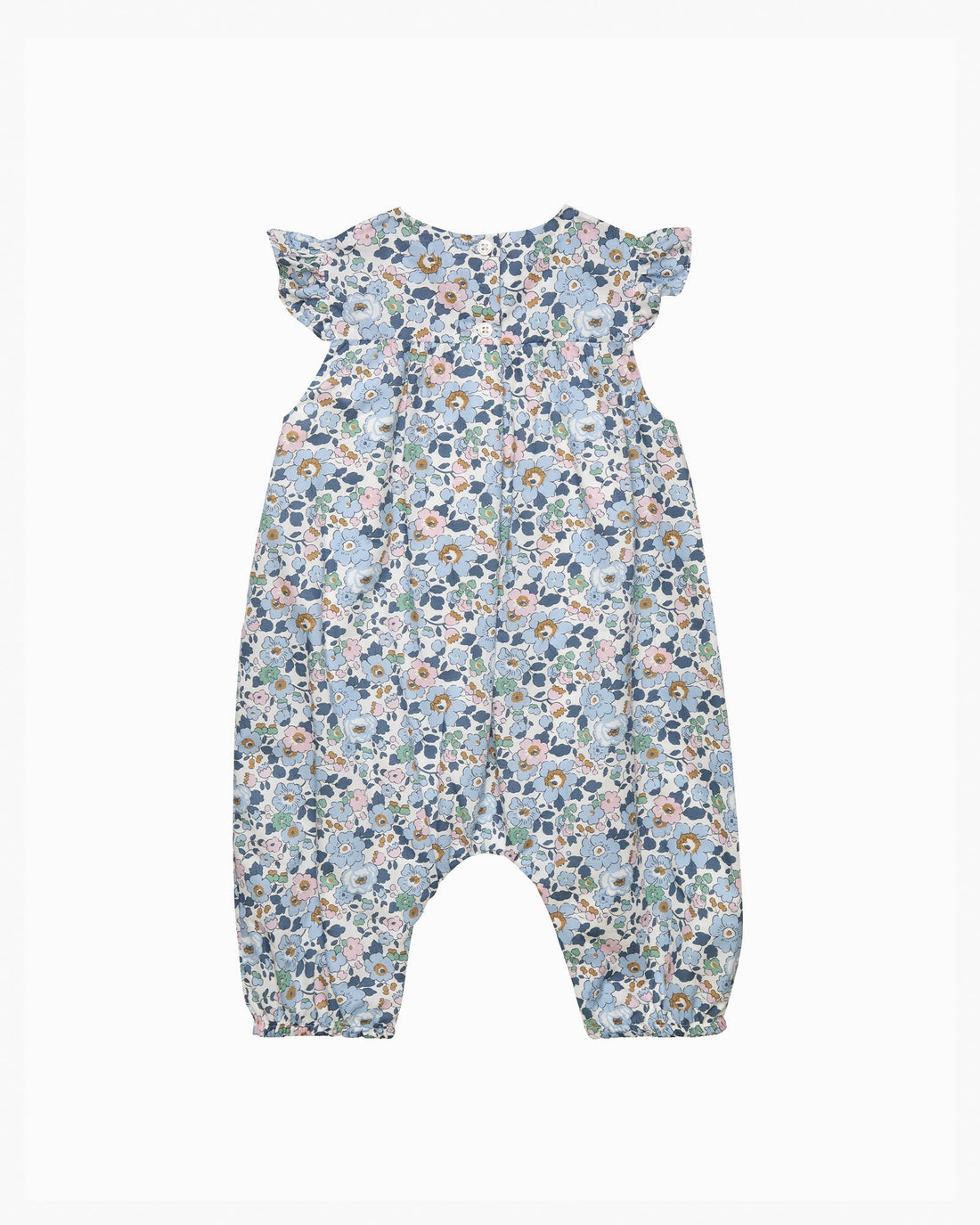 Made in Liberty's Betsy print fabric, an iconic stylized floral design that dates from the 30s, this romper for baby girls features delicate frill cap sleeves as well as a complementary blue grosgrain bow across the chest. The addition of elasticated ankle cuffs create a sweet silhouette while popper fastening allow for easy dressing and changing.