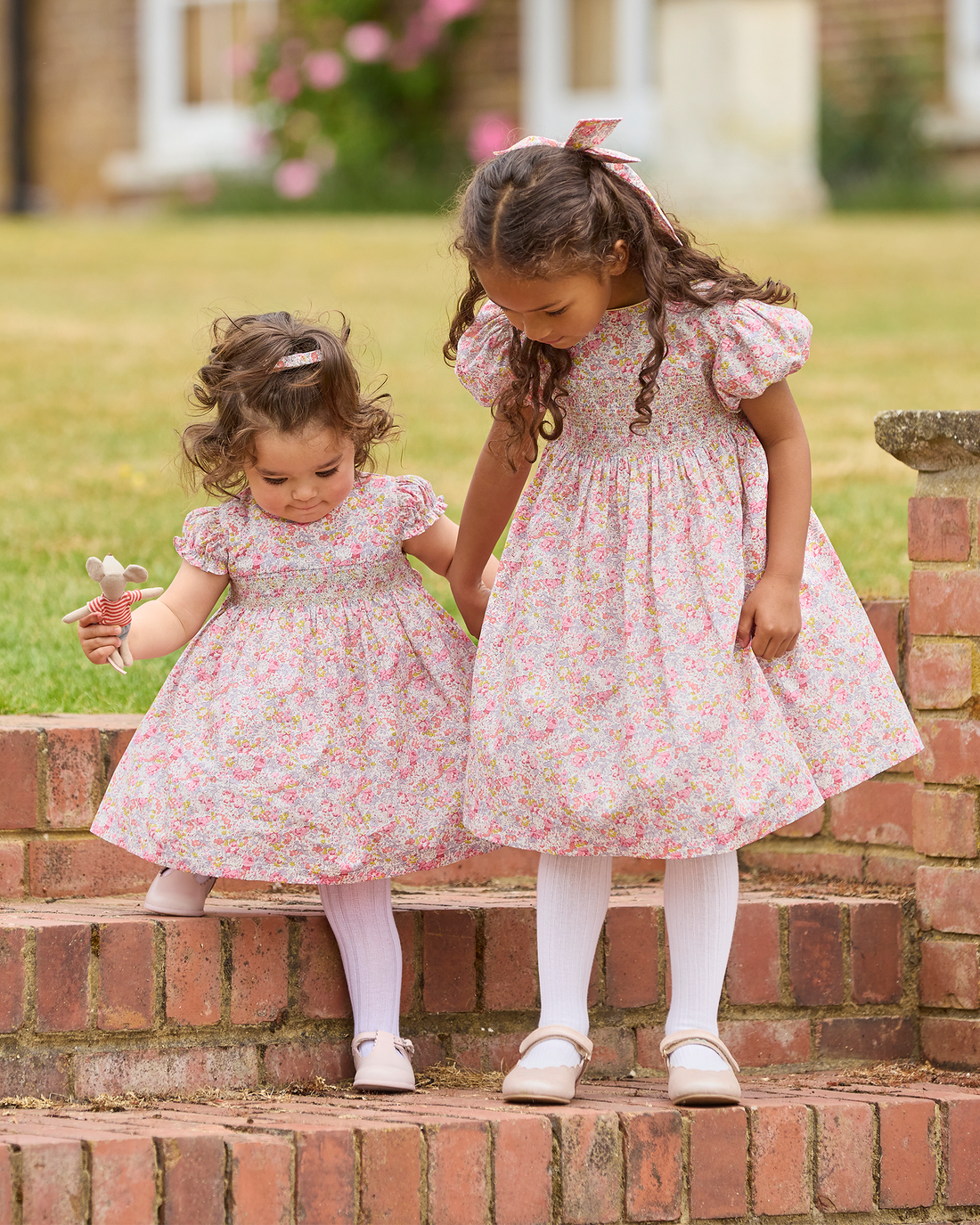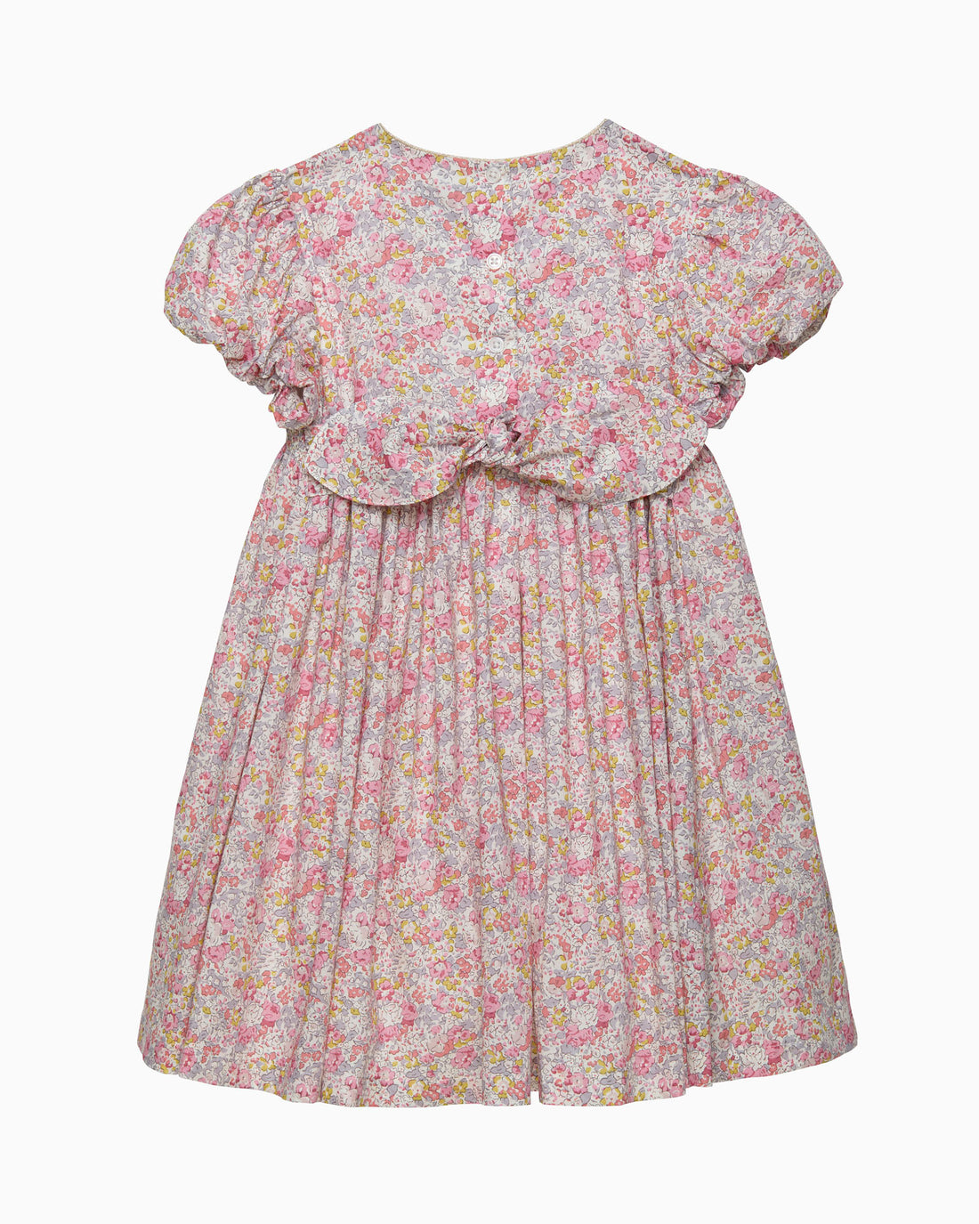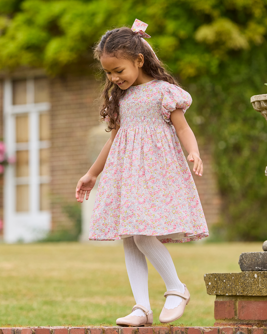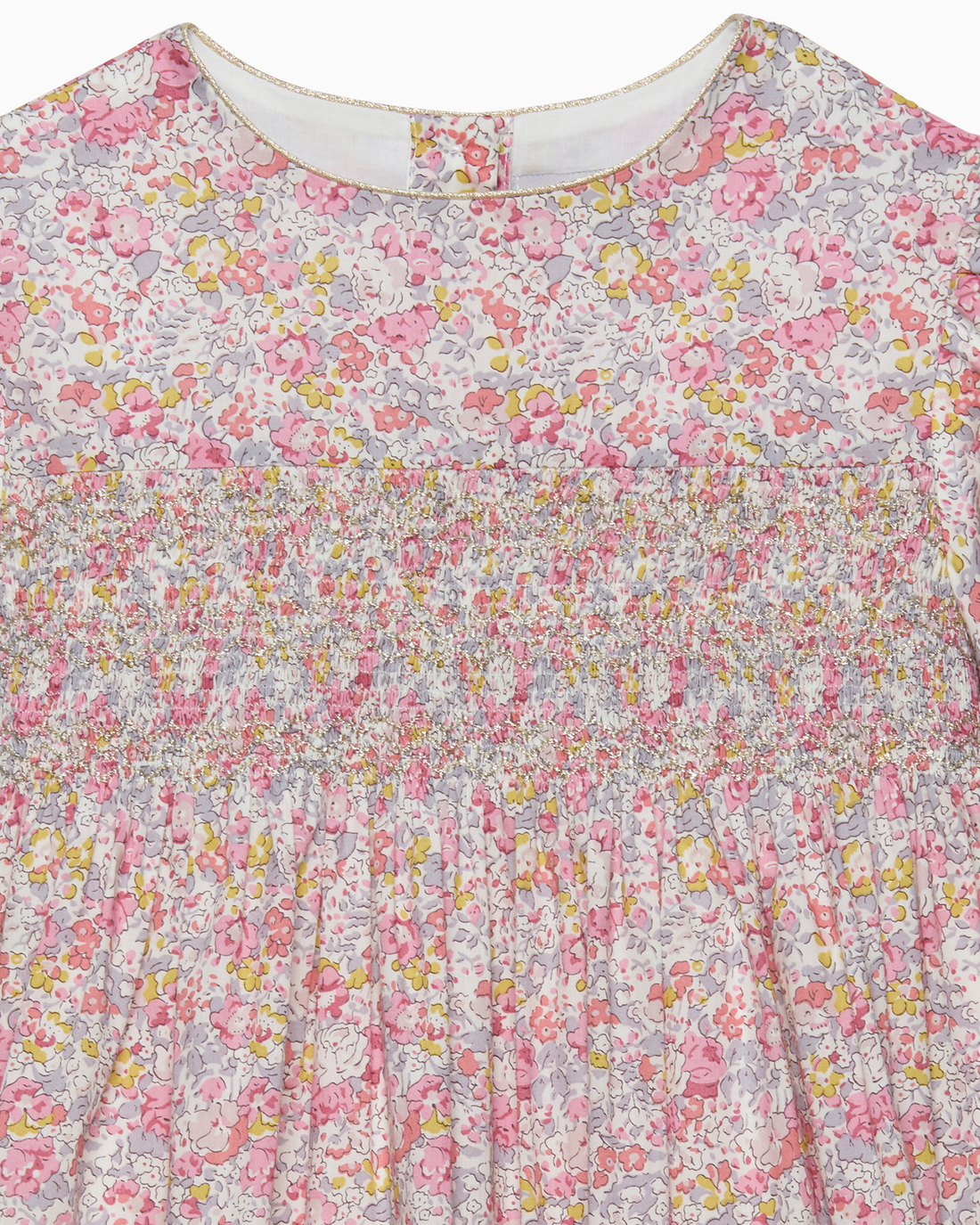 Made in Liberty's Claire-Aude print fabric, dense and sketchy flower forms within an almost abstract print, this smart, collarless party dress comes with statement puff sleeves, luxe metallic gold smocking across the front and matching gold piping for the perfect finish. Fully lined and perfect for twirling, it's the ultimate party dress!