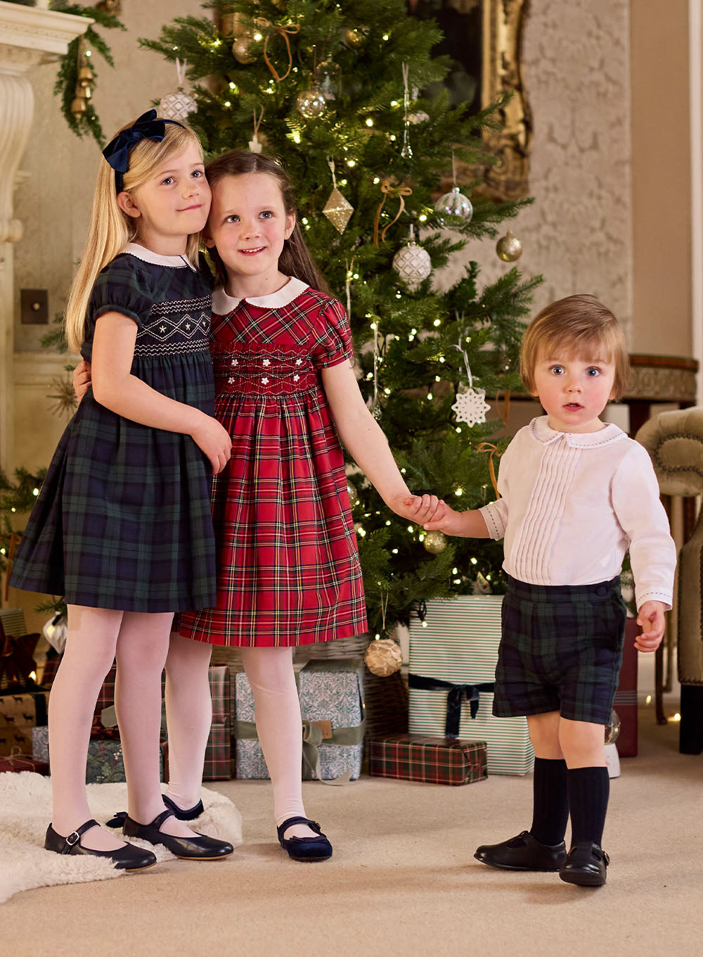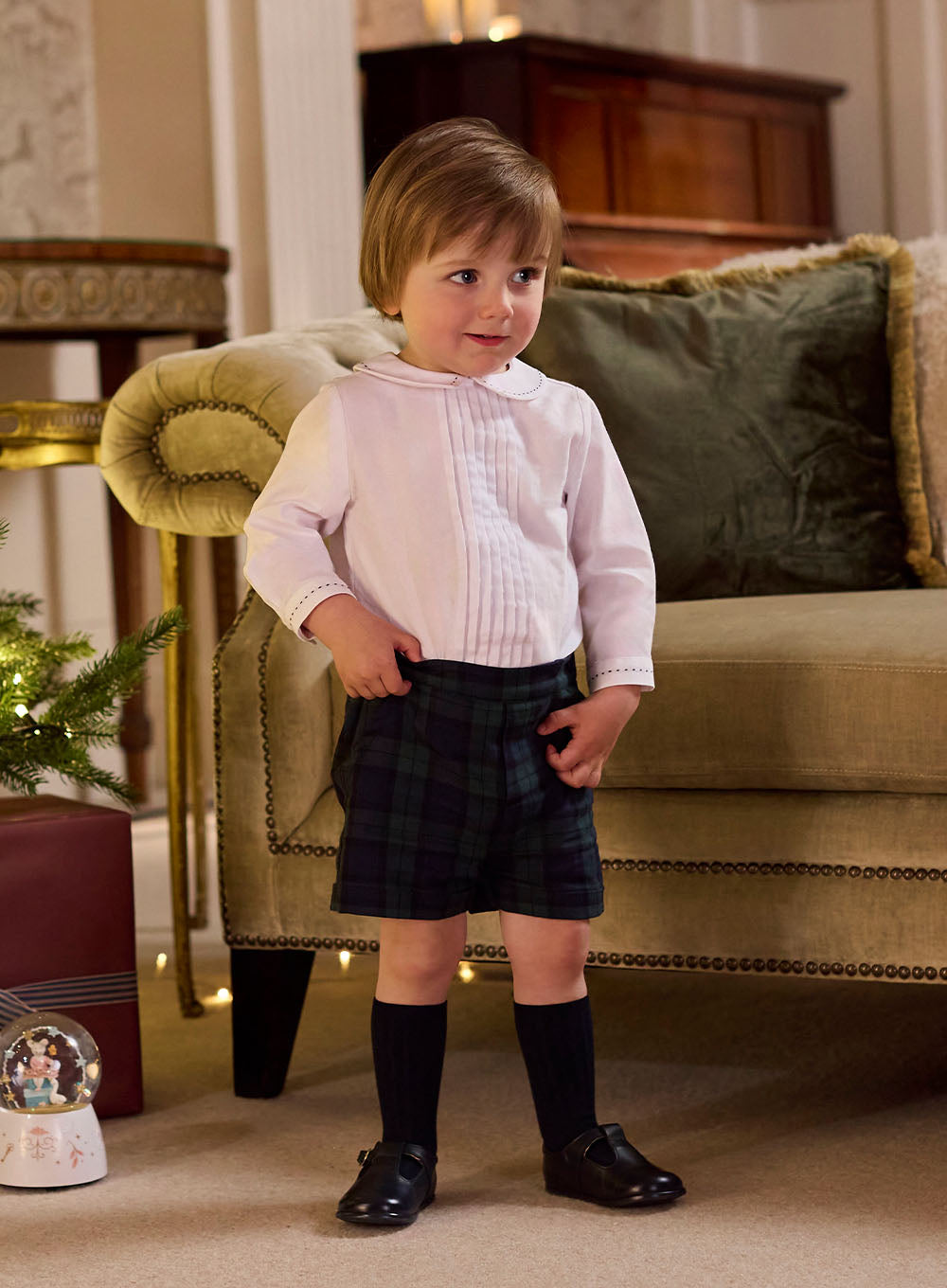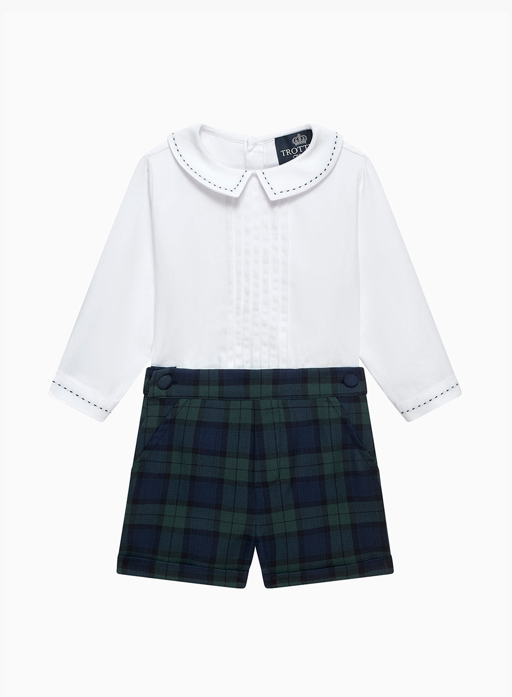 Our bestselling Rupert set has been updated for the festive season and now comes in a classic navy plaid, with a smart, white cotton long-sleeved cotton shirt with front pleating, complete with Eton collar and navy stitch detailing. Neatly fastens via concealed buttons to a classic pair of shorts this makes a great, onesie outfit for babies and young boys that will keep little tummies under wraps during those smarter festive occasions.Available up to a size 6/7Y.