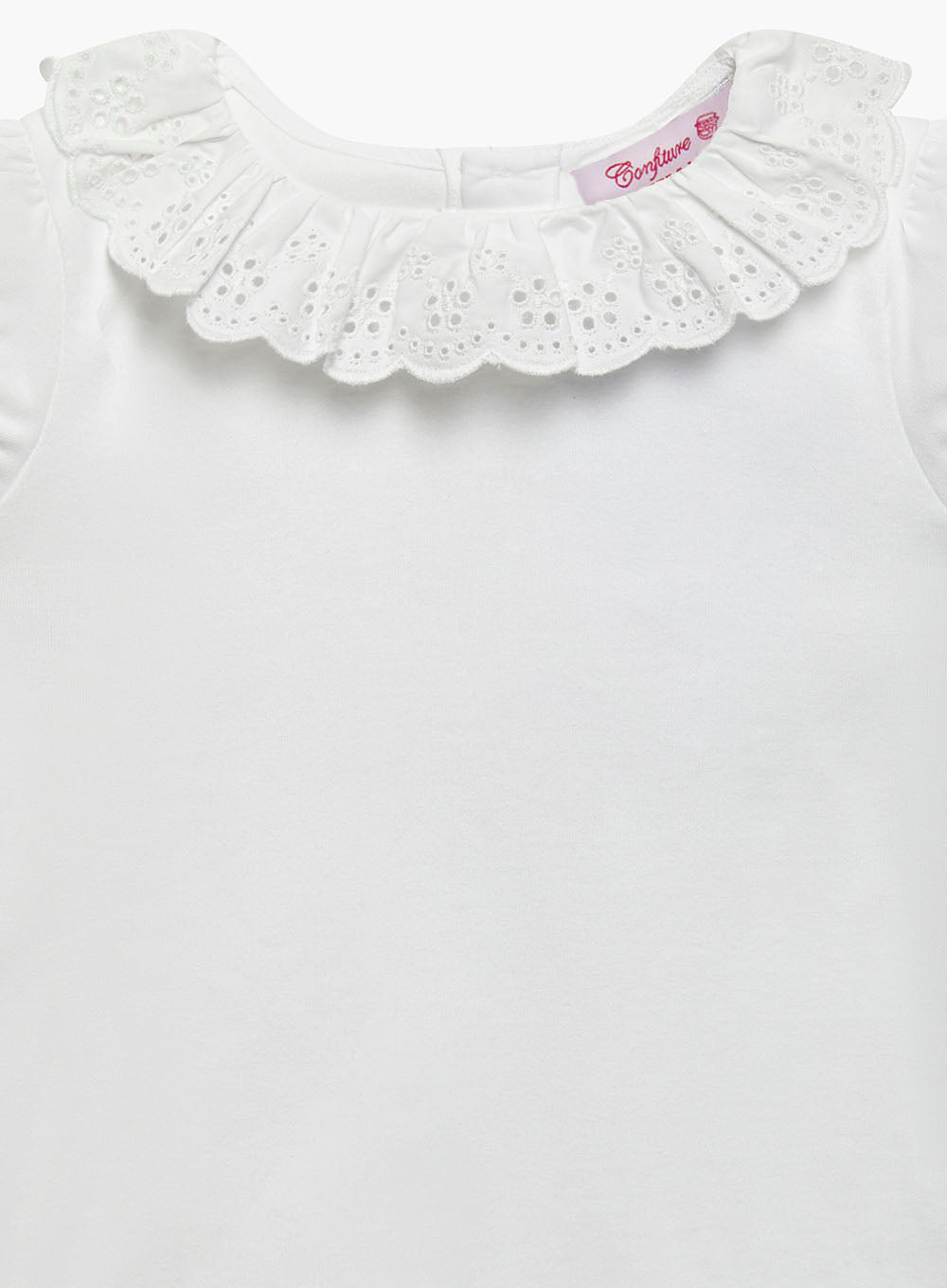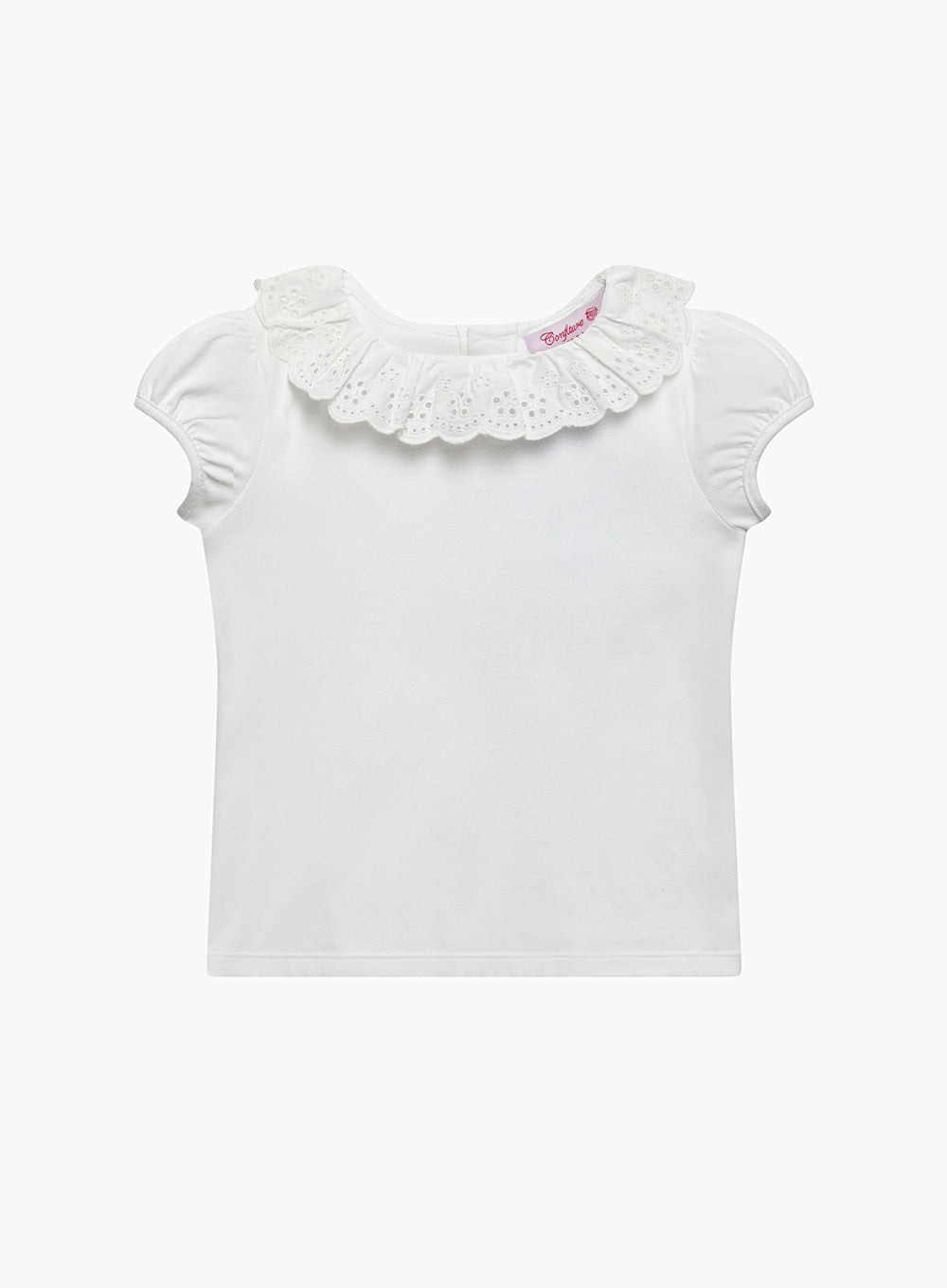 A new style for Trotters this year, this classic white t-shirt has been elevated to wardrobe staple with a twist, thanks to it's statement broderie anglaise willow collar and cute capped sleeves. Perfect for pairing with any outfit, it is sure to become your spring/summer go-to.